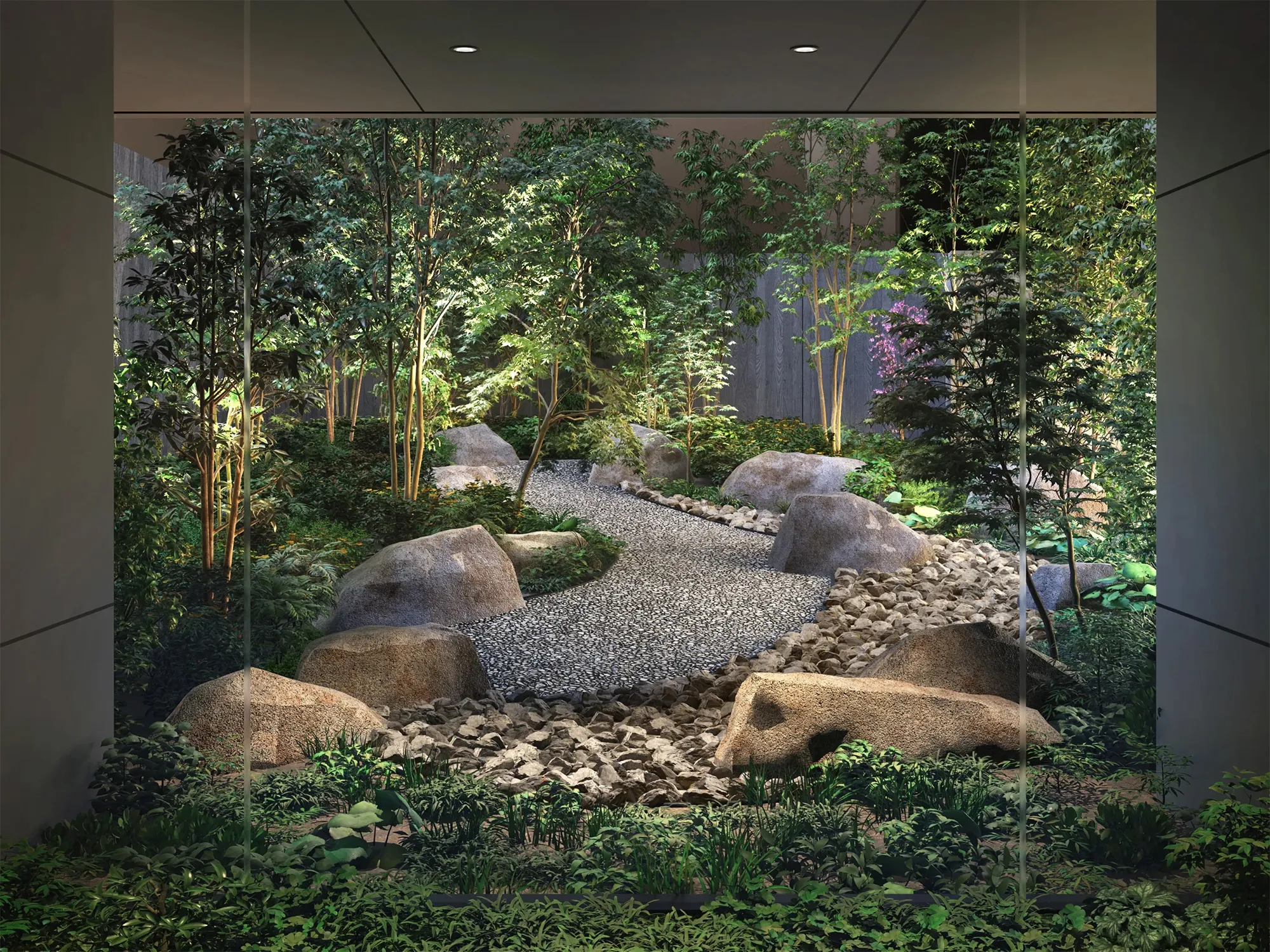 建物の一歩外に出ると立川の都心部なのですが、それを忘れてしまいそうな自然いっぱいに枯山水も品があり素敵です。それほど広くない空間ではありますが、周辺の街の特徴がギュッと取り入れられ、工夫が凝らされたデザインに感服してしまいます。