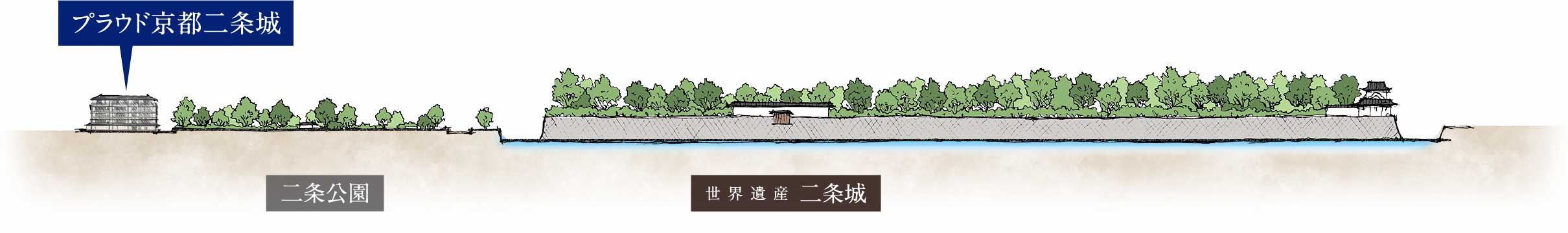 永遠に眺望が約束されたかのように見える二条公園とその先に二条城、この眺望の抜けは資産価値ですね