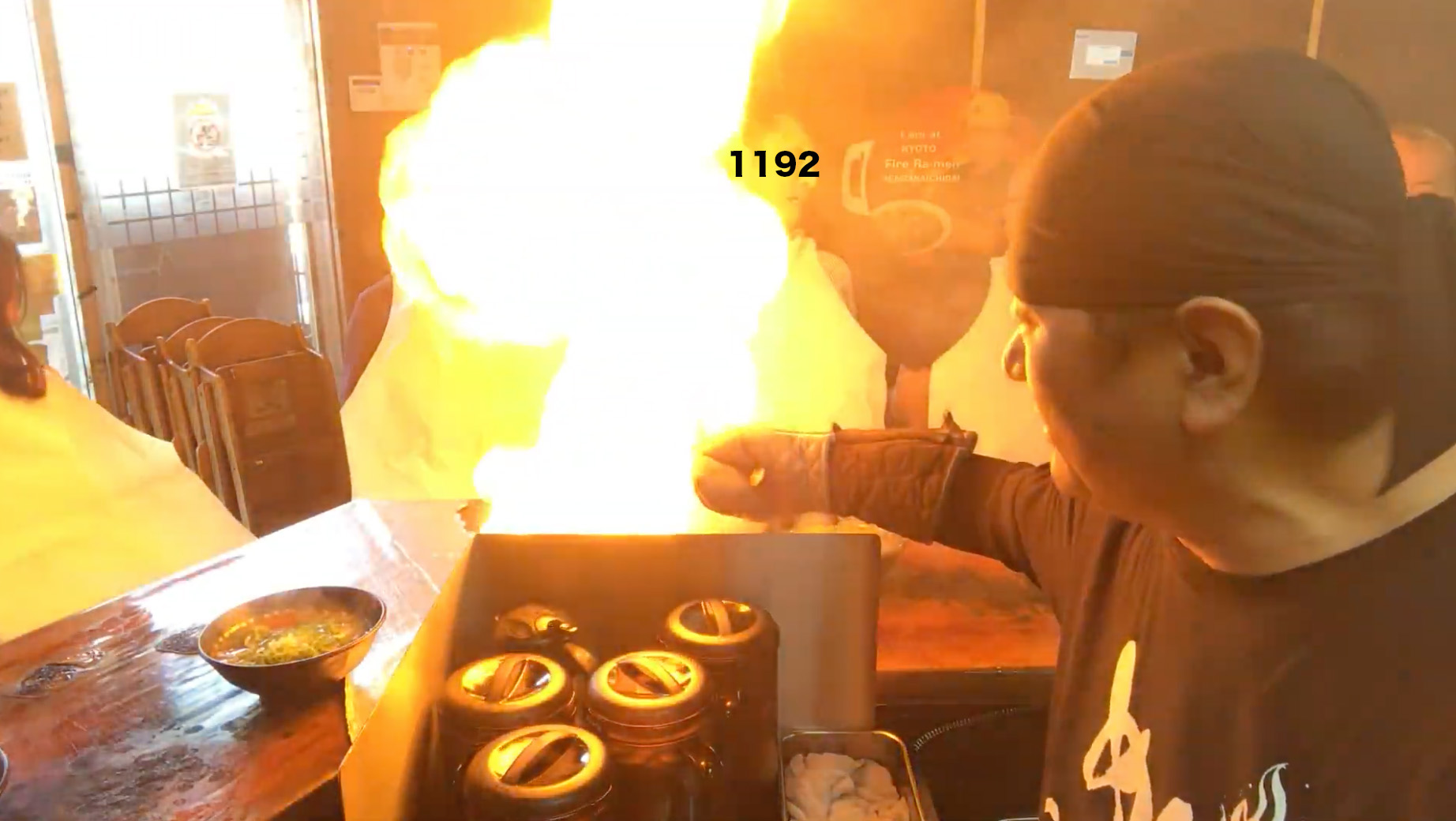ファイヤーラーメンを2回経験している地元民としては稀有なkyoto1192です。写真は2018年のインバウンド全盛時に初めて行った時のものです。両隣は中国人で「京都に来たら絶対に立ち寄るお店!!」と言ってました。もはや事故のような火柱。インバウンドなんて言葉が無かった1984年開業の歴史あるお店