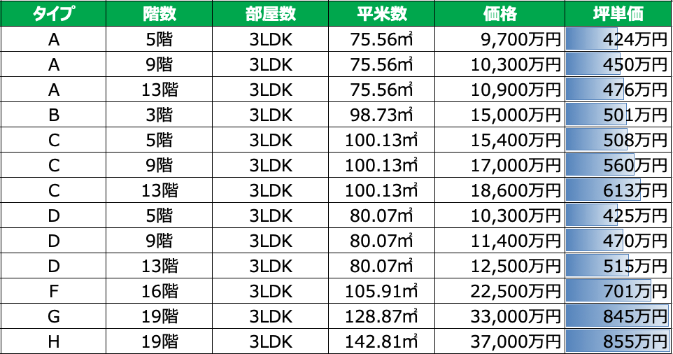 この坪単価差は100㎡換算だと3,300万円ほどの価格になるため、100㎡超住戸の希少性はあるものの広い部屋にこれだけ価格が乗ると辛いものはありますね。