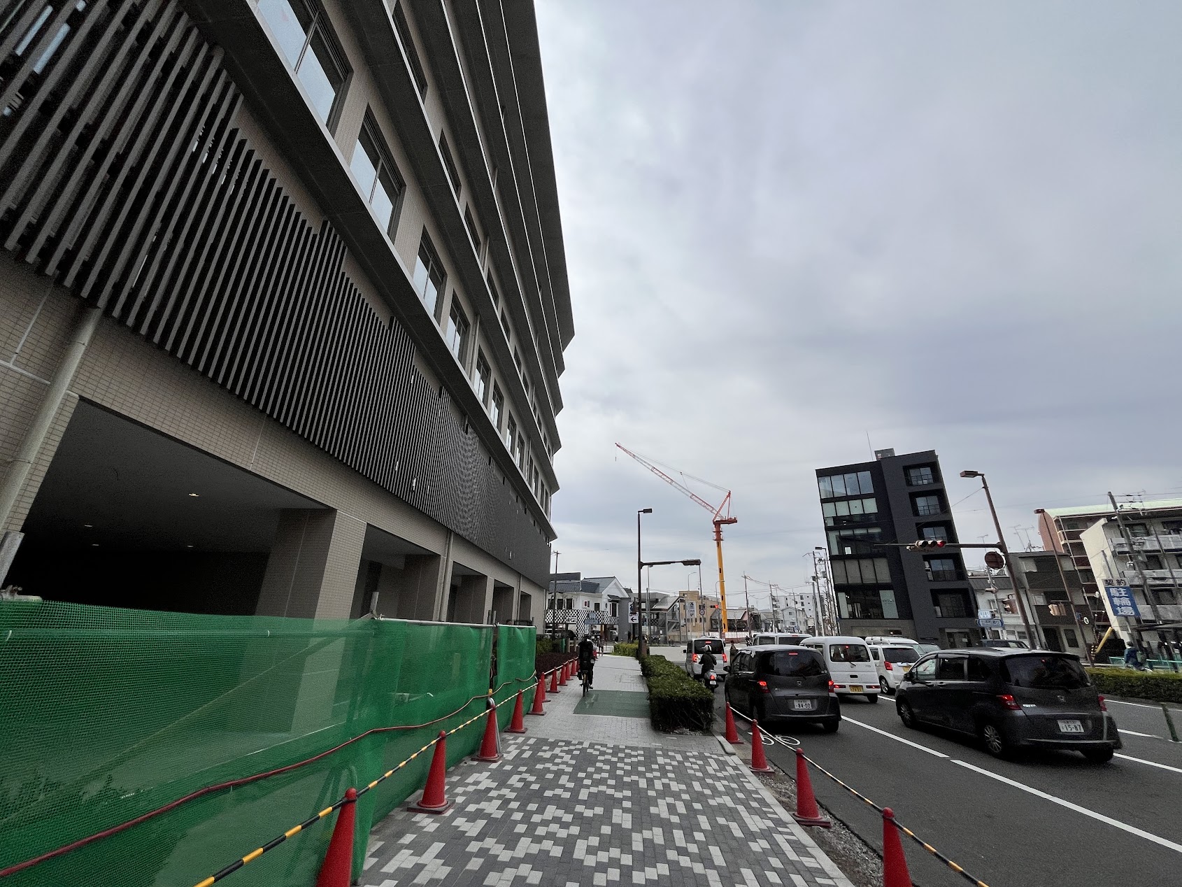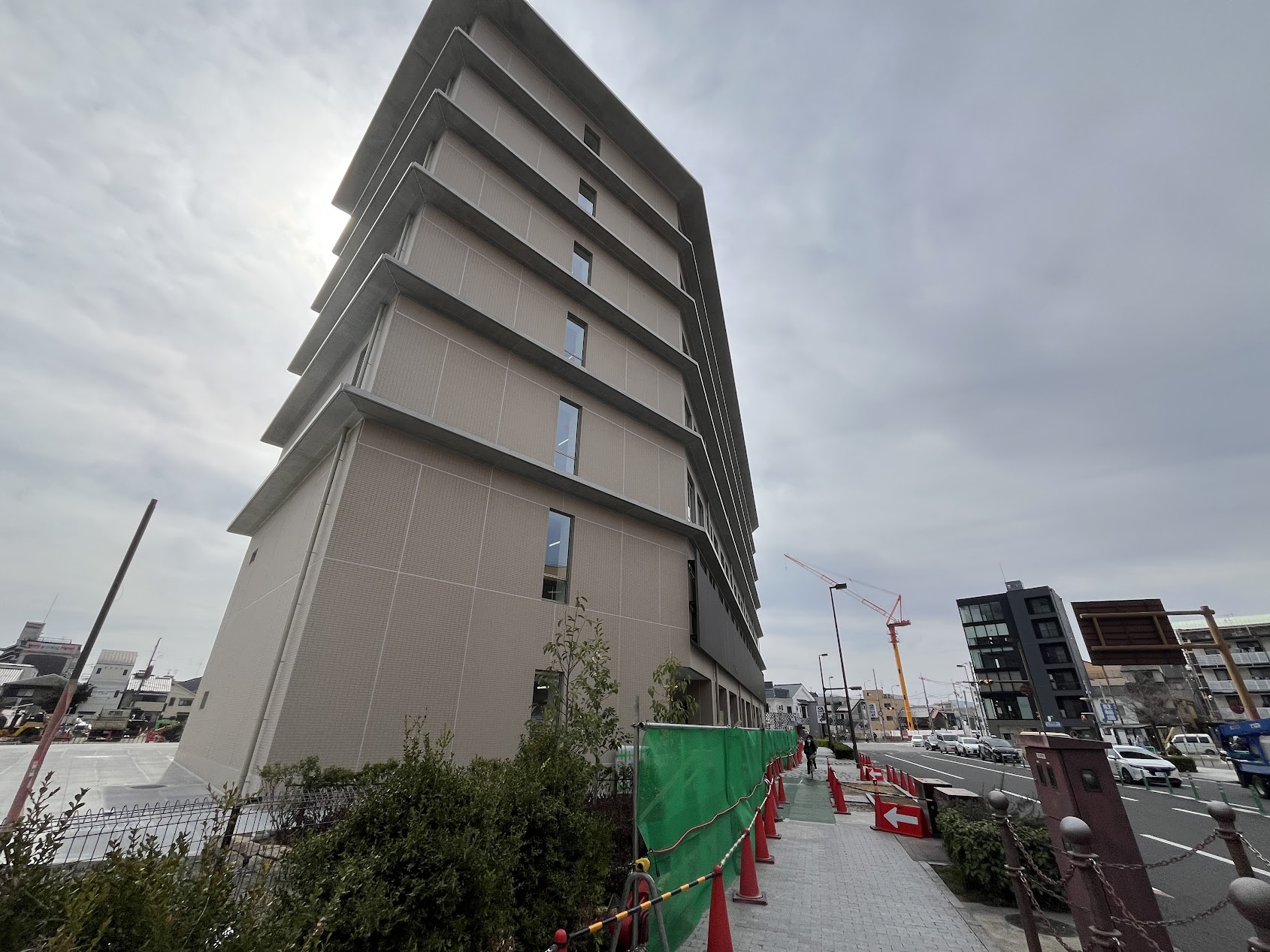 そして、駅正面にほぼ完成と思われる「佛教大学二条キャンパス」(2号館)。2026年4月には社会福祉学部および社会福祉学研究科を紫野キャンパスから二条キャンパスへ移転します