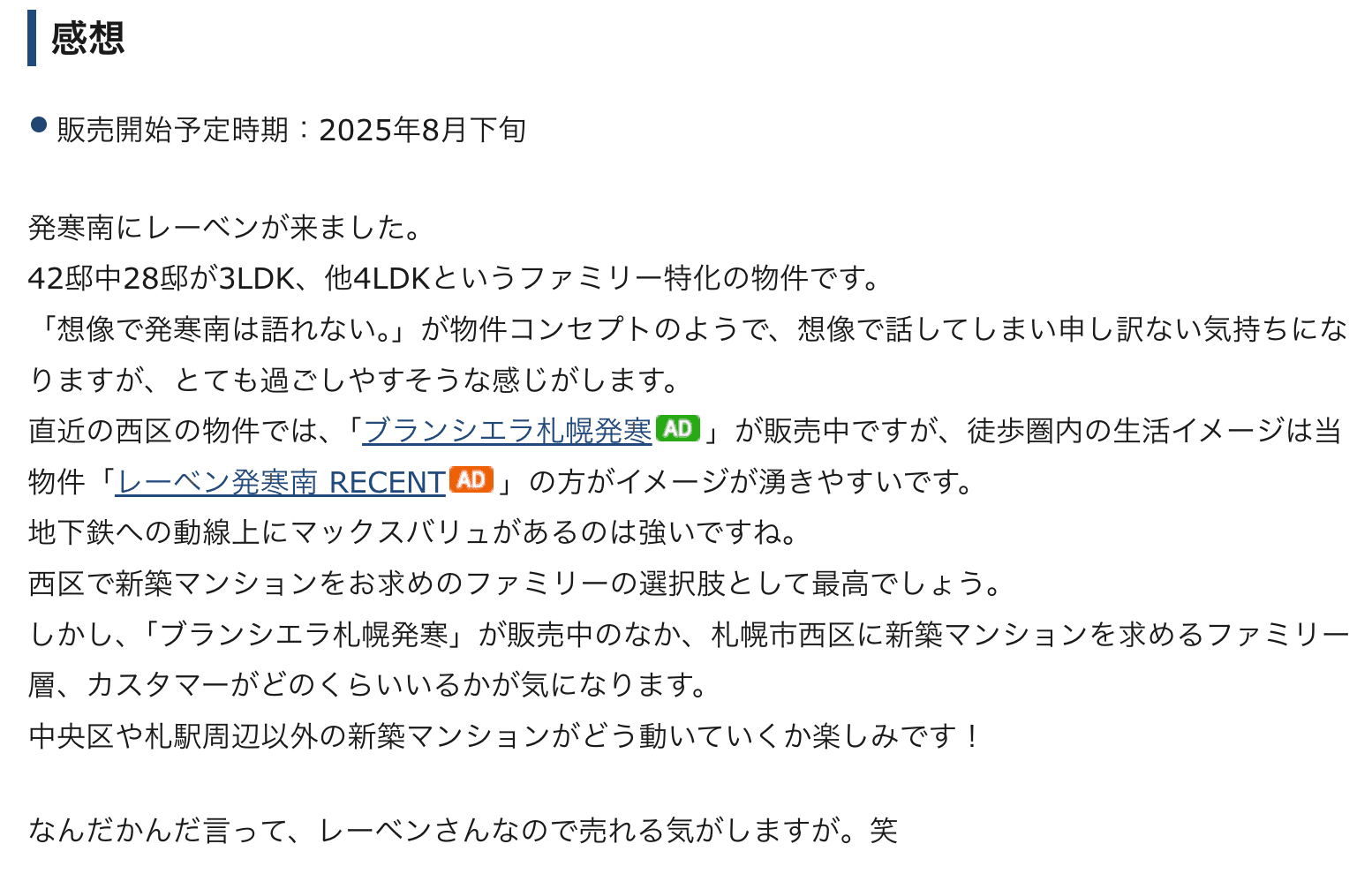 以上、「レーベン発寒南 RECENT」のレビューでした!