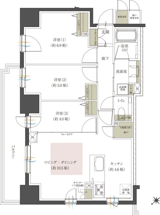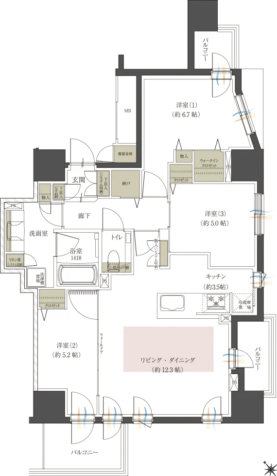 - 販売専有面積:68.17㎡~86.10㎡(※一部備蓄倉庫面積0.60m²含む)