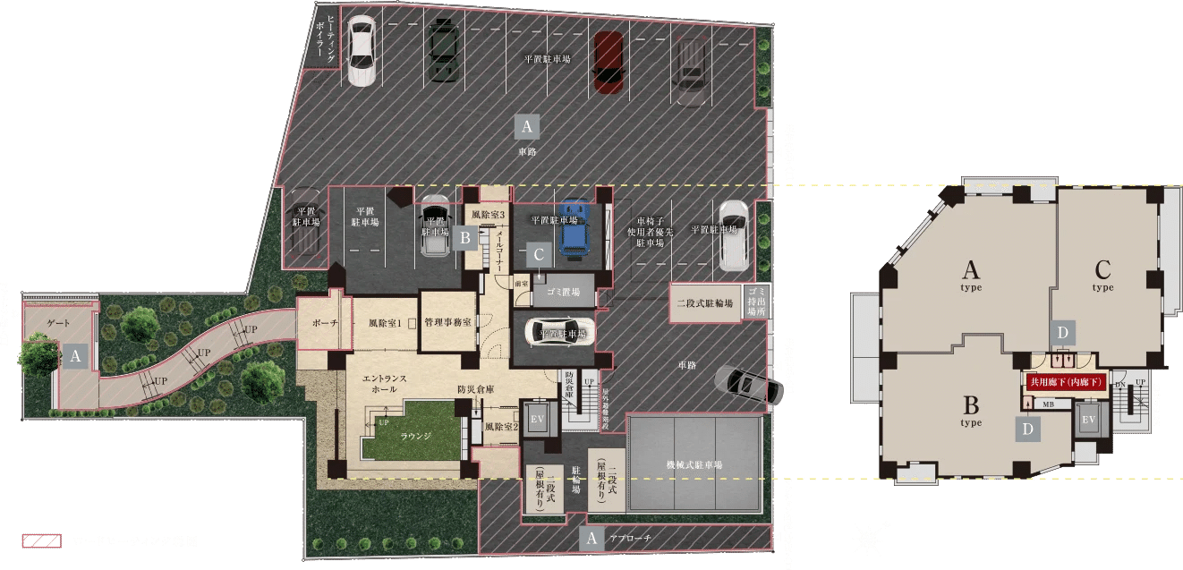 共用部はエントランスラウンジだけで、1フロア3世帯エレベーター1台の三戸一になっています。風除室は3箇所。
