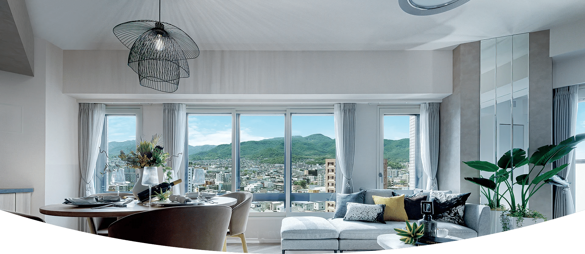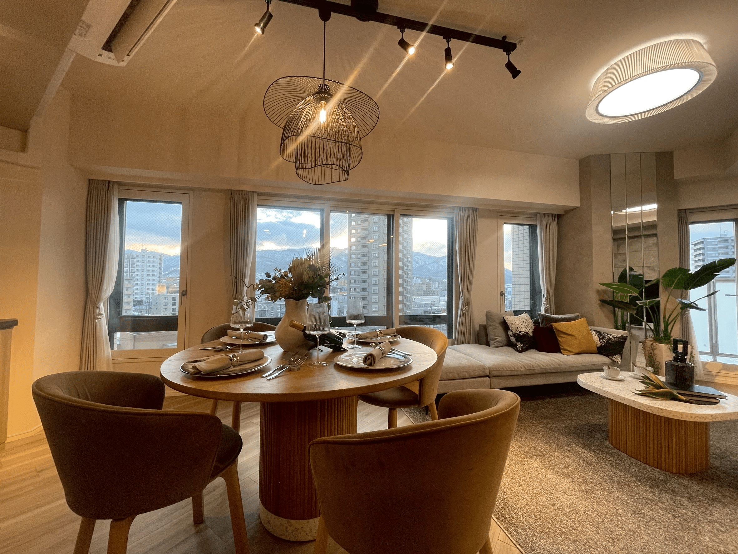 下の現地7階モデルルームからの実際の写真ですが、窓が多くて開放感があり、素敵でした。普段見慣れている中央区からの眺望と比較して、とにかく抜けています。山も近いですし、高い建物があまりないため、新鮮な景色を楽しむことができました。ちなみに7階モデルルームは家具付き販売とのことです。