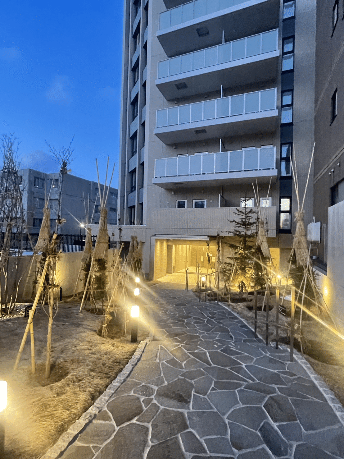 実際に見た感じ、「よっしゃ家に帰ってきた、今日も俺、1日おつカレー」って気分になれるアプローチでした。帰ってきた感と家愛が増すような雰囲気です。↓夜もライトアップされて良い感じです。