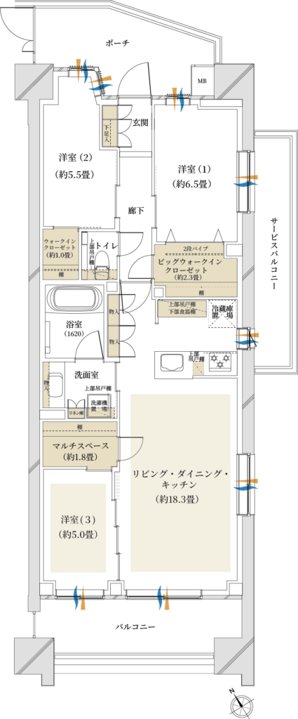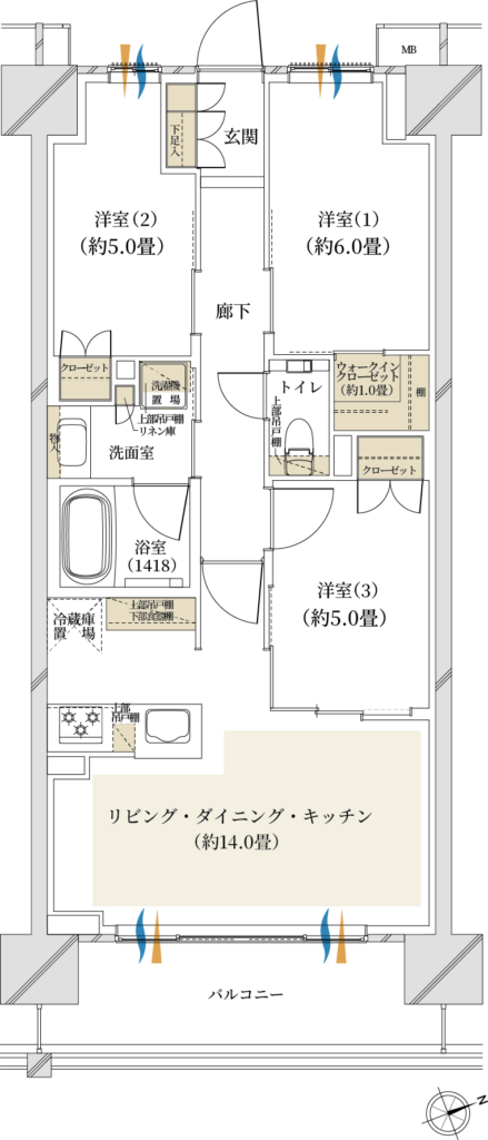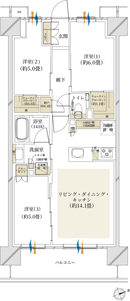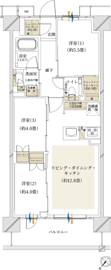 △:専有面積が3LDKの割に小さい、洋室3が窓無し、洋室2・3がリビングIN×ウォールドアで遮音に弱い、浴室小さめ、リビング窓と洋室3窓に隔たりがある&洋室3の窓が小さく広々感は出にくい