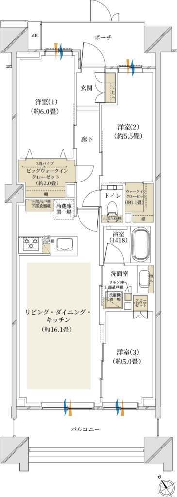 - 3LDKにしては専有面積が小さめ(60-65㎡)