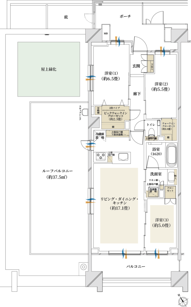 S-Nrタイプ(3LDK|77.23㎡)○:採光多め、洋室3にも床暖房、洋室1からの景色が屋上緑化、角部屋×ポーチでプライバシー確保、浴室広め