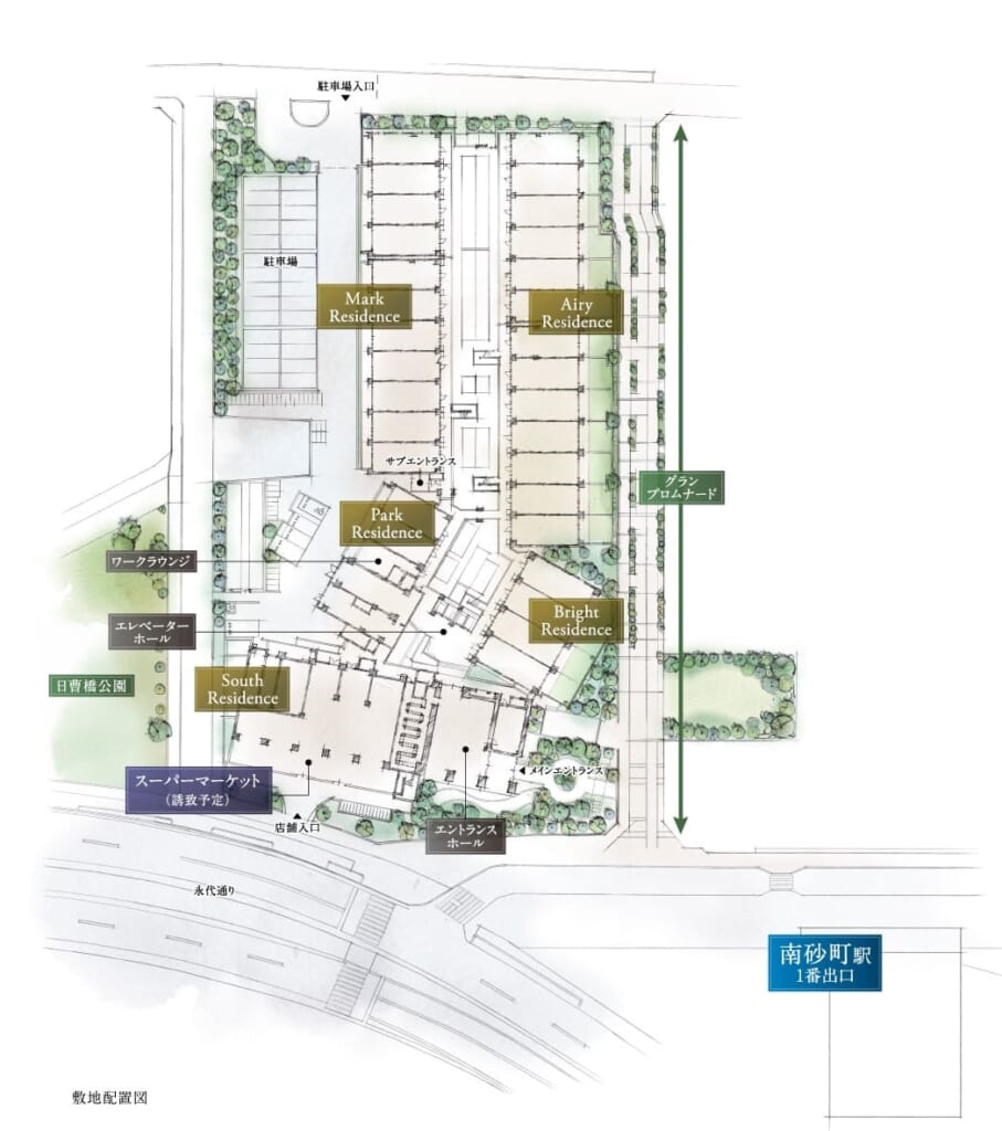 - 駐車場:119台収容(機械式116台、平置き2台、身障者用1台、月額利用料:27,000円~40,000円)