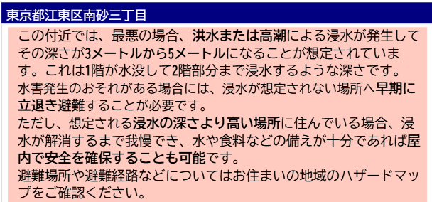 クレストプライムシティ南砂がある「江東区南砂3丁目」には水害のハザードが付きます。最大で2階相当まで浸水なので、リスクヘッジするなら4階以上が良いと思います。深川エリアの中古市場を見ていると、浸水1階相当だと1-2階の売れ行きが鈍くなっている印象で、万が一の売却を考えると浸水相当+2階以上が良いと感じています。