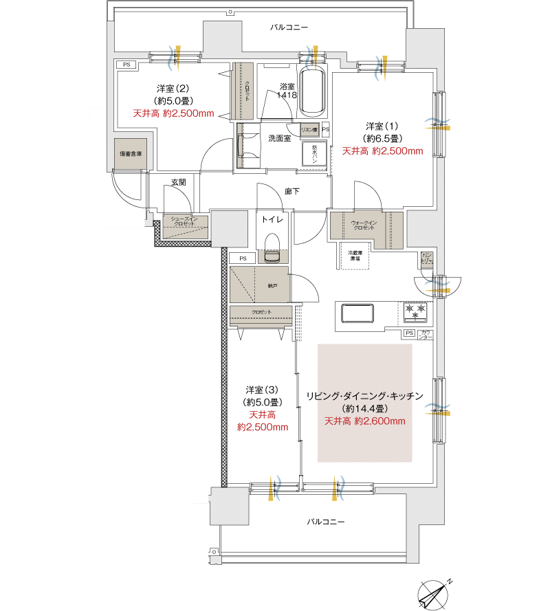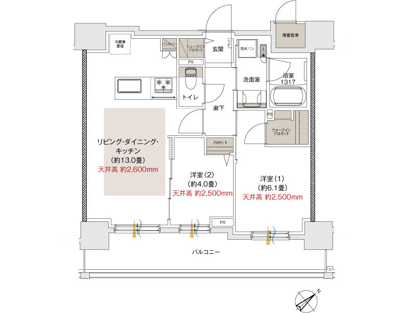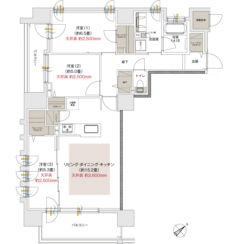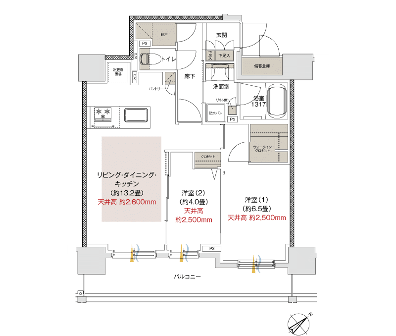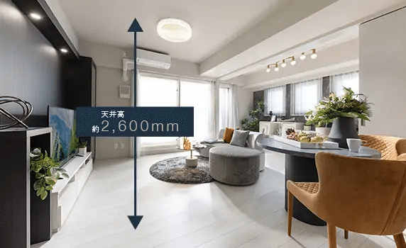 専有部のリビングの天井高が2.6mなのは嬉しいポイントです。