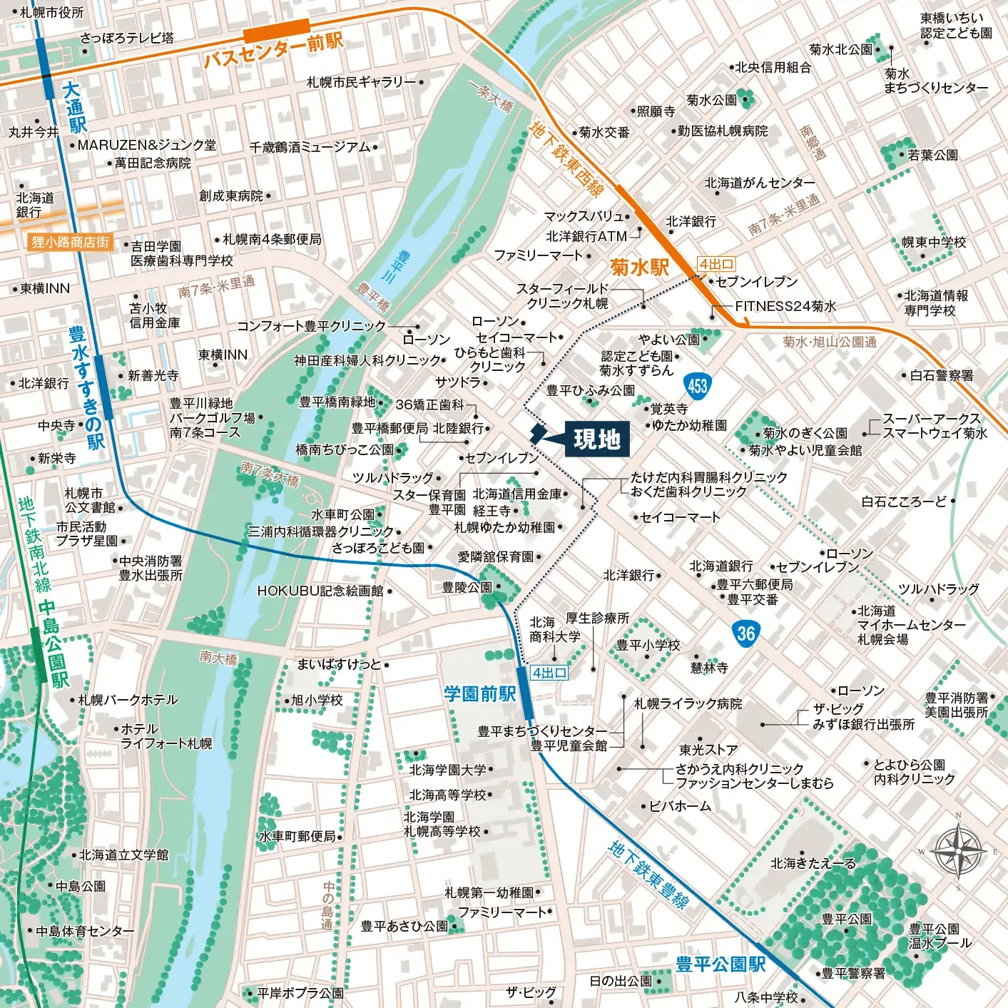 国道36号線沿いにあり、豊平川までは徒歩6分、川を越えればすぐにすすきの・大通と中心部への近さが魅力的な立地です。