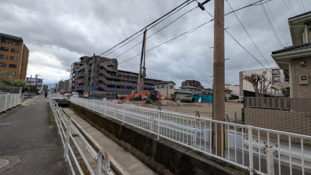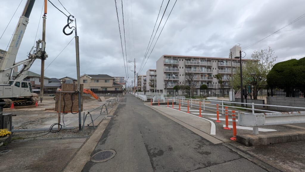 もともとは田んぼが広がっていた地域で、昔の用水路が走っています。写真のように物件東側にも用水路が通っており、その横が物件に面した道路となっています。この道路は非常に狭く、車が何とかすれ違えるぐらいです。そのため、用水路の一部を暗渠にして、すれ違うための退避場所があったりもします。物件自体も西側にセットバックさせて造られるようです。大型車の運転は少し不便な面があるかもしれません。