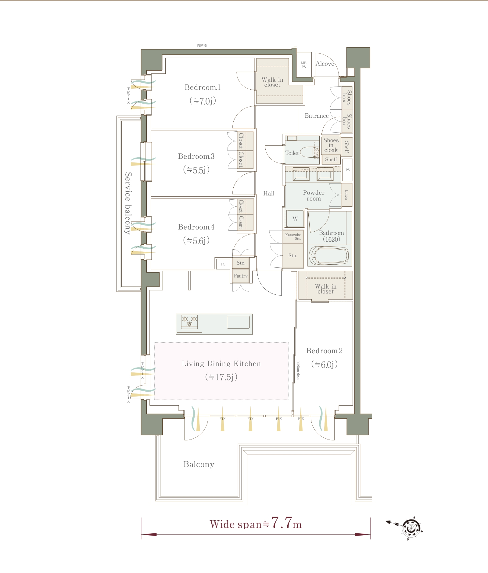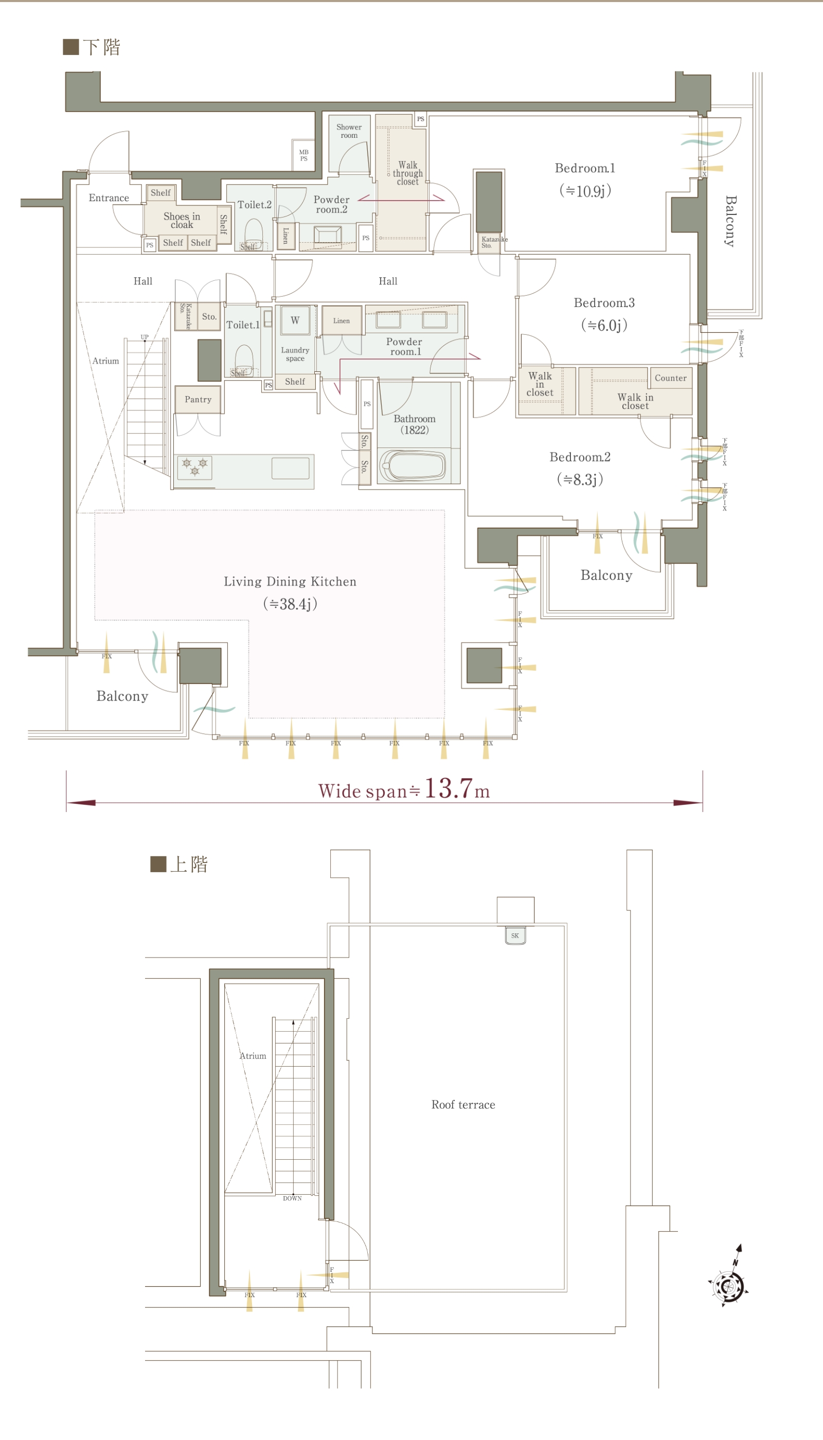 最上階の5階はプレミアムフロアとなっており、南向き両角の住戸には専用のルーフテラスが設けられています。
