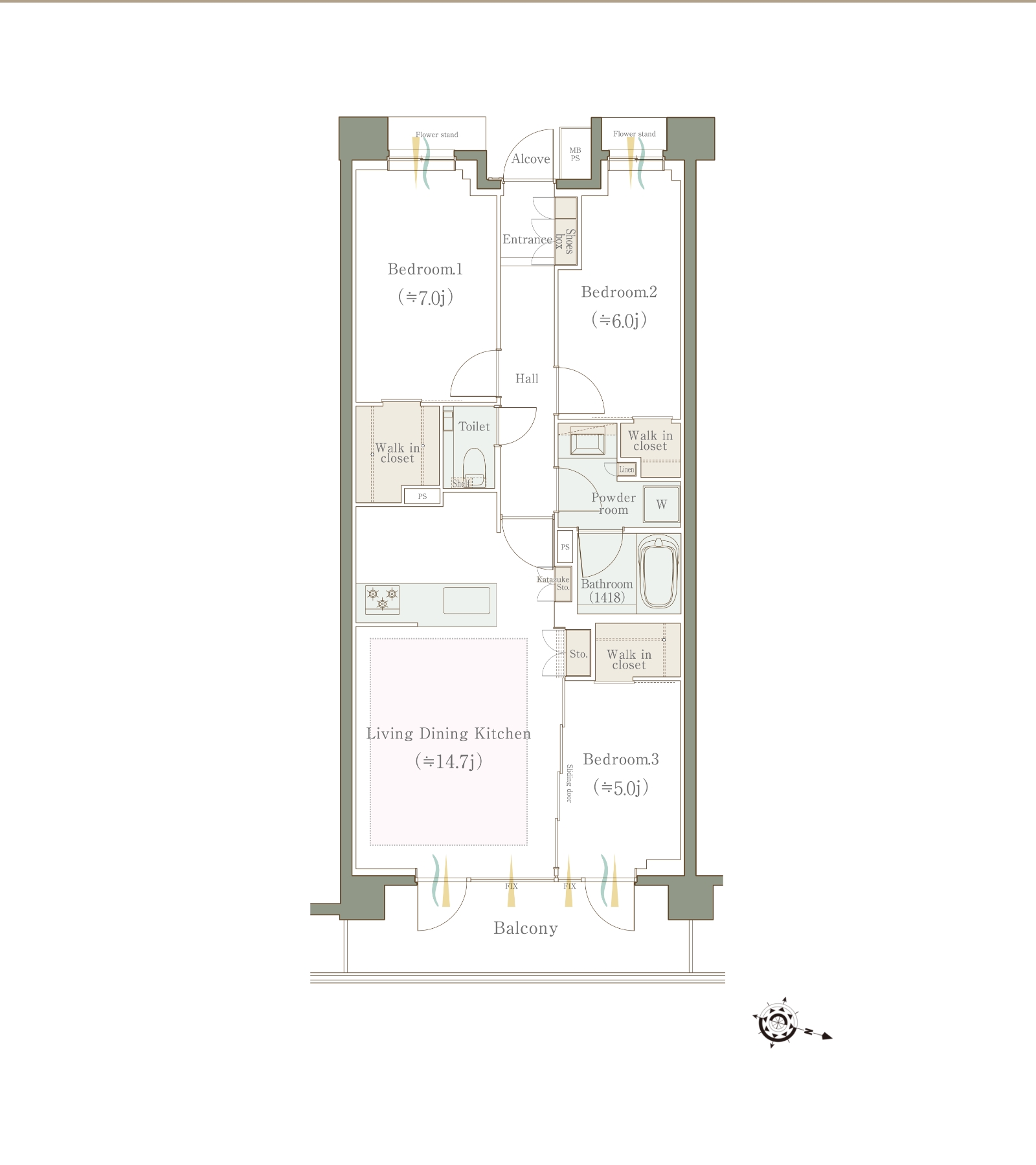 1・4と番号を振った角住戸はバルコニーがクランクしており、東角(4の住戸)は南向きに、西角(1の住戸)は西向きにバルコニーが設けられています。