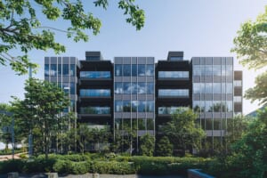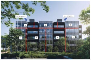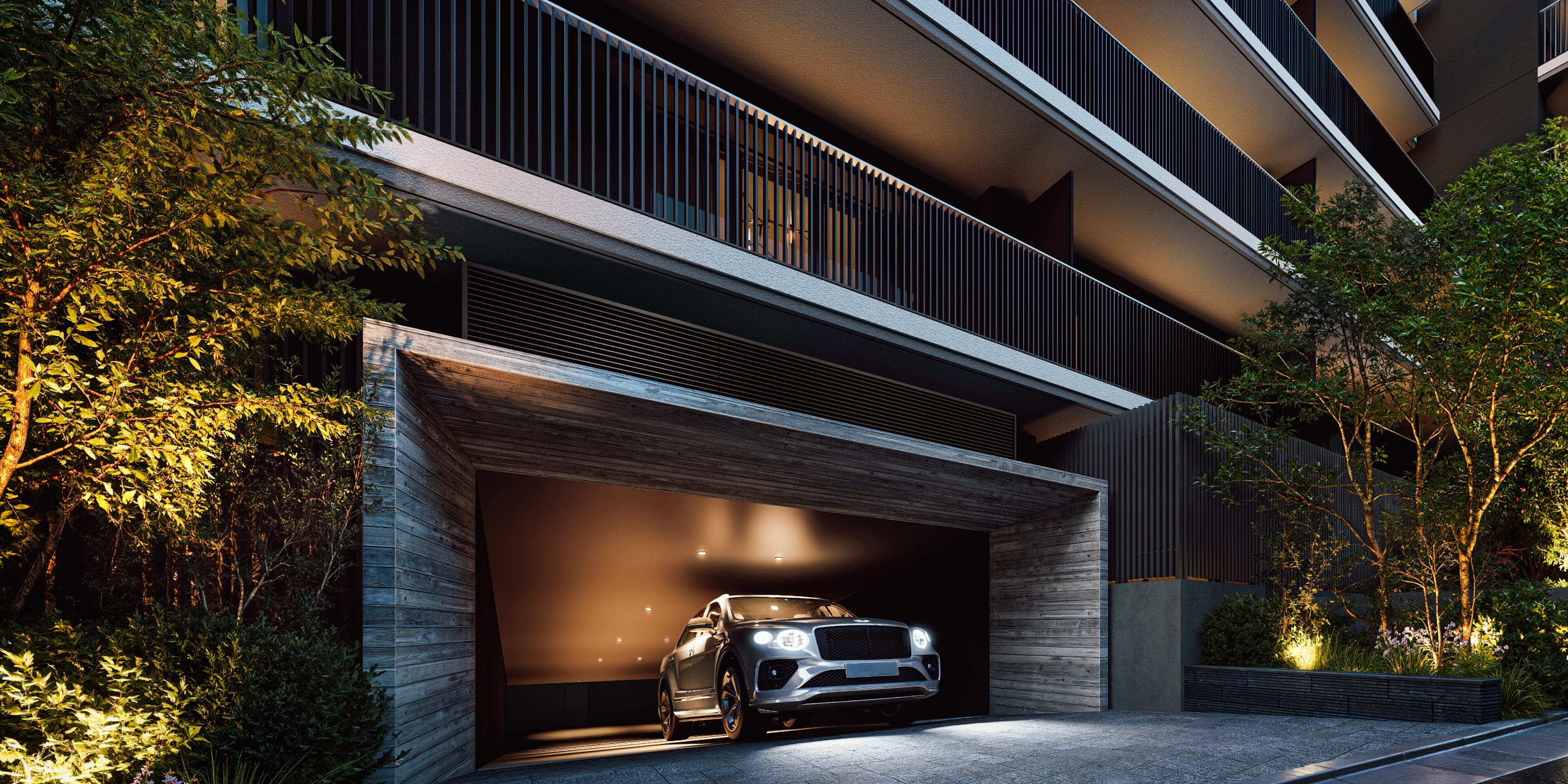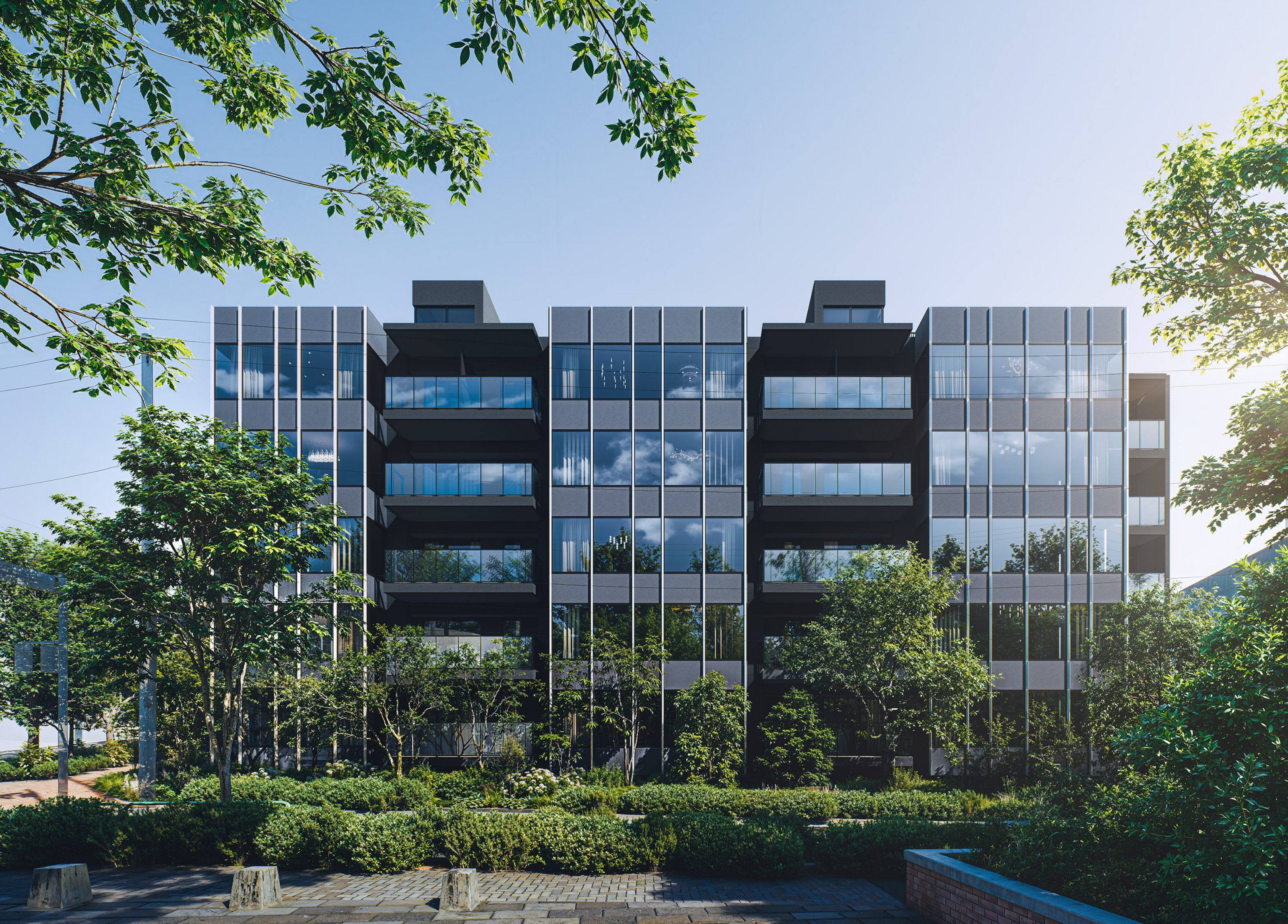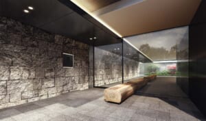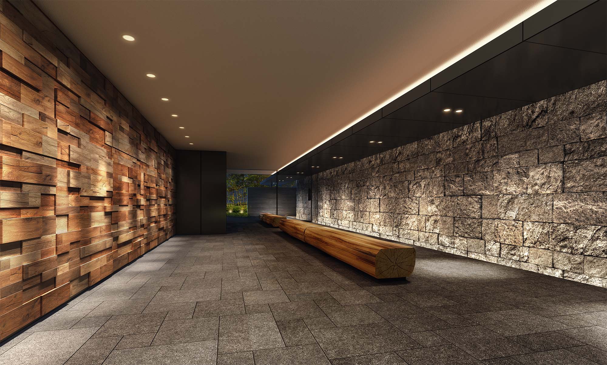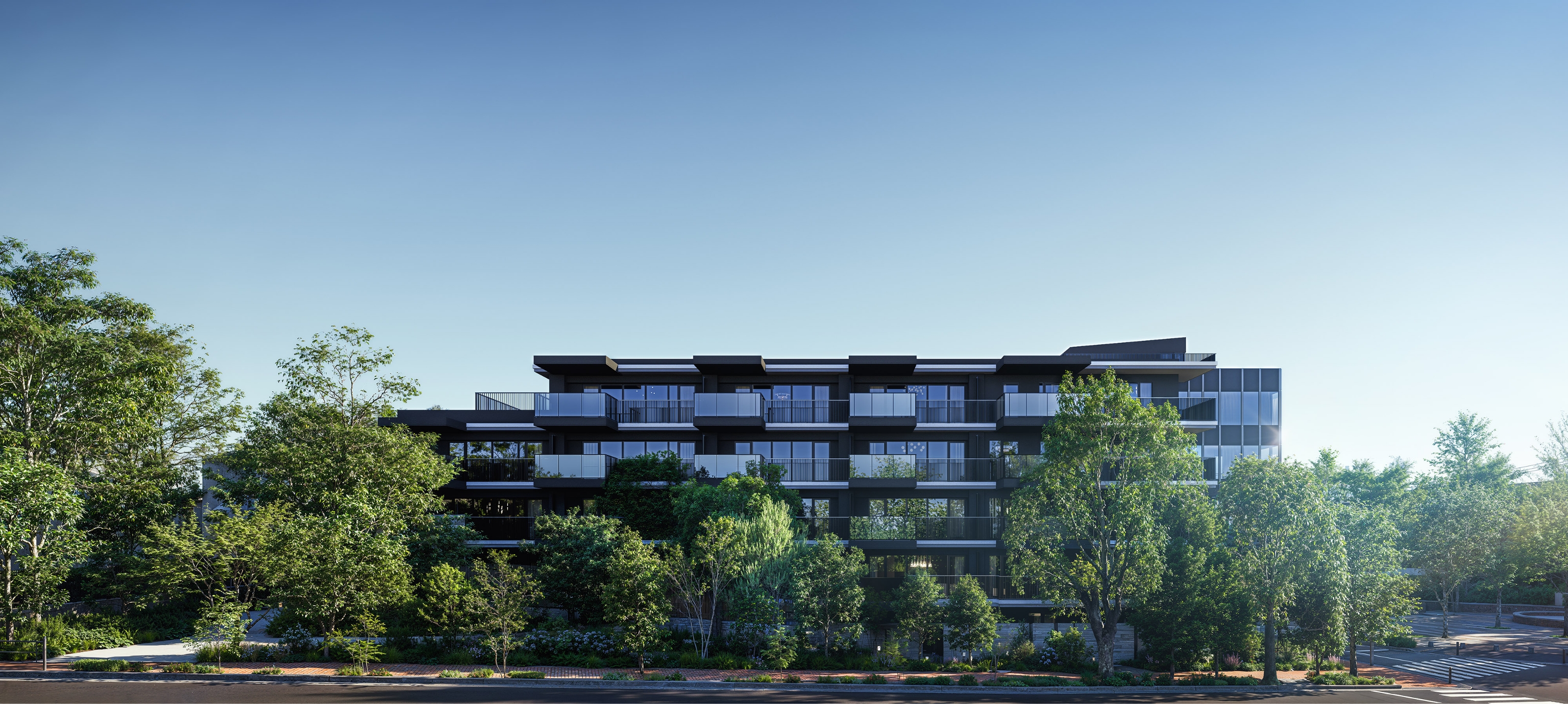 本件はかつて豪邸が建っており、敷地内には木々が生い茂っていました。駅徒歩4分ながらも緑の潤いを感じられる静かな住環境を引き継ぎ、共用部には既存樹の木材がちりばめられています。開放廊下が中庭を囲うように設けられ、周辺の木々の音や木漏れ日を感じられるよう、あえて開放廊下にしているとのことでした。▼南向きの外観完成予想