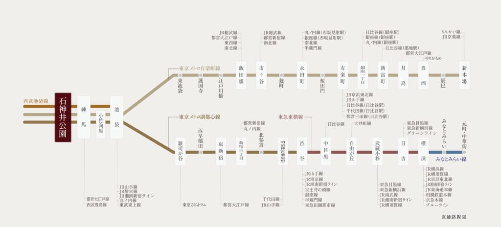 石神井公園は西武線での池袋へのアクセスだけでなく、副都心線を利用して渋谷へ、さらに東急東横線への乗り入れにより、中目黒、自由が丘、横浜、みなとみらいまで直通しています。さらに、東京メトロ有楽町線への乗り入れもあり、飯田橋、市ヶ谷、有楽町など都心部へのアクセスも良好です。