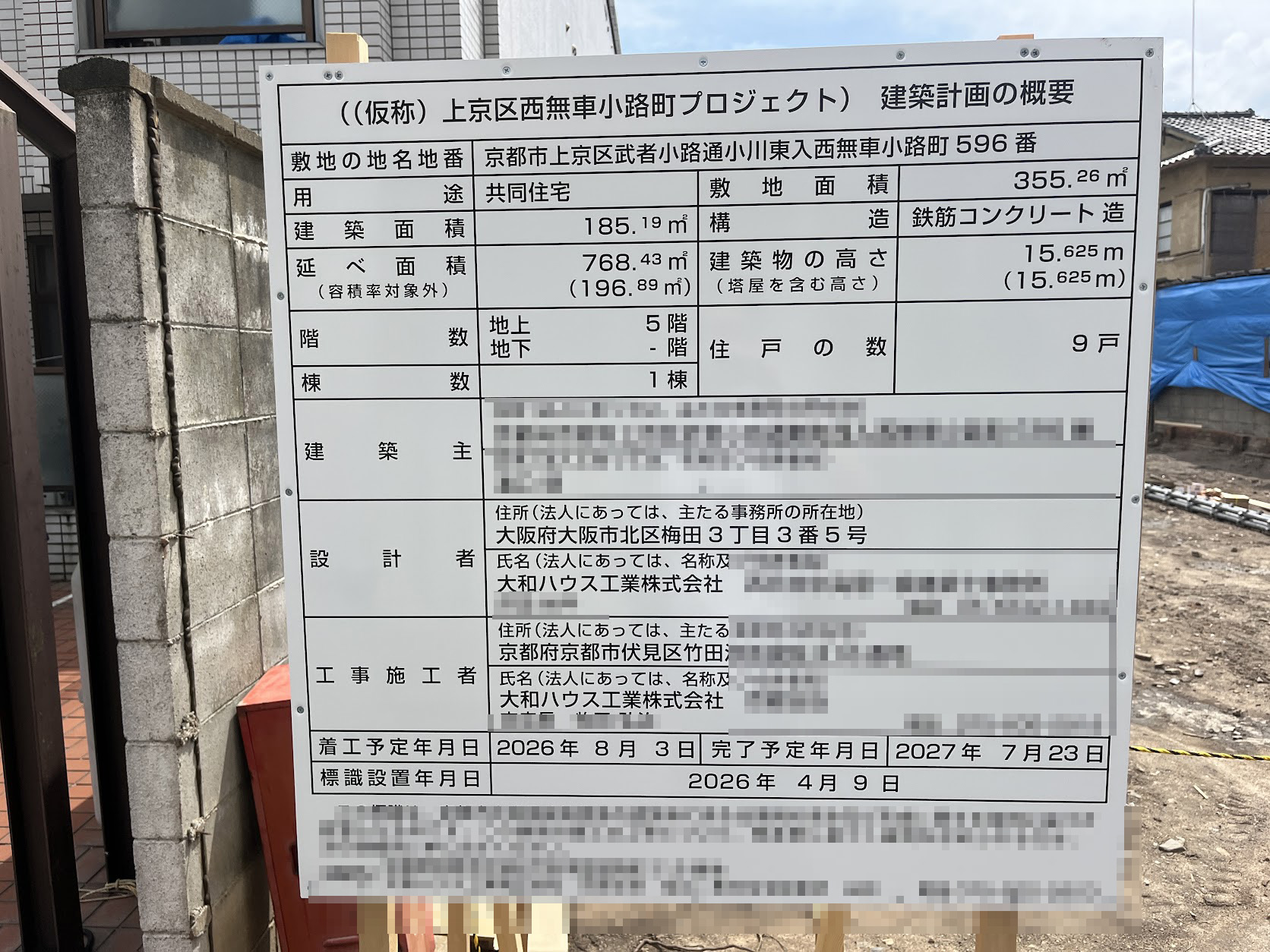 「上京区武者小路小川東入ル西無車小路町596に、大和ハウスが5階建ての集合住宅をつくるようです。延べ面積768㎡で9戸なので、億ションかもしれません」