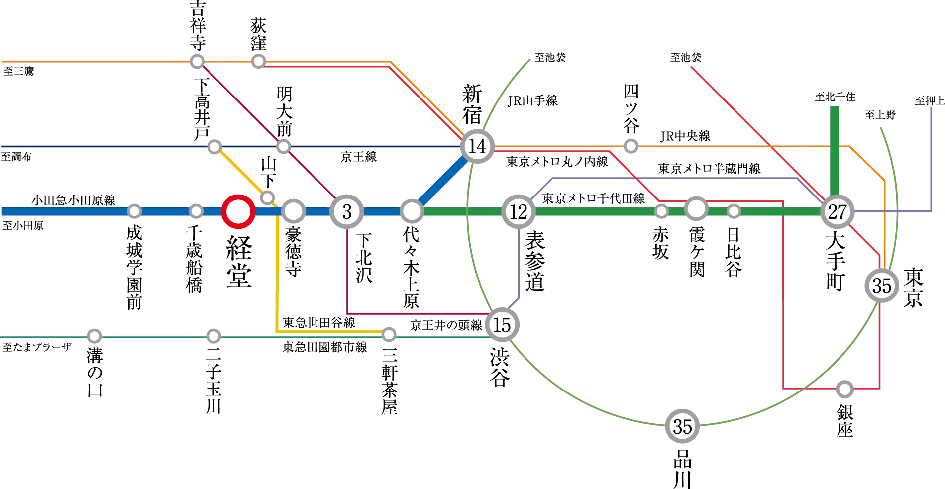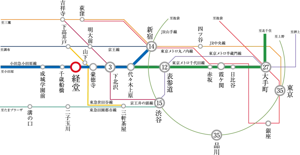 経堂は小田急小田原線の急行停車駅です。新宿まで14分(日中12分)、下北沢まで3分、表参道へも乗換で12分と、都心アクセスは抜群。地下鉄千代田線直通かつ複々線工事完了と言うことで、私鉄の中でも飛びぬけて鉄道設備が整っている渡船だと思います。世田谷区アドレスでありながら、価格帯は下北沢や桜新町よりも控えめになりやすく、「コスパのある世田谷」という位置付けでも検討したいエリアです。