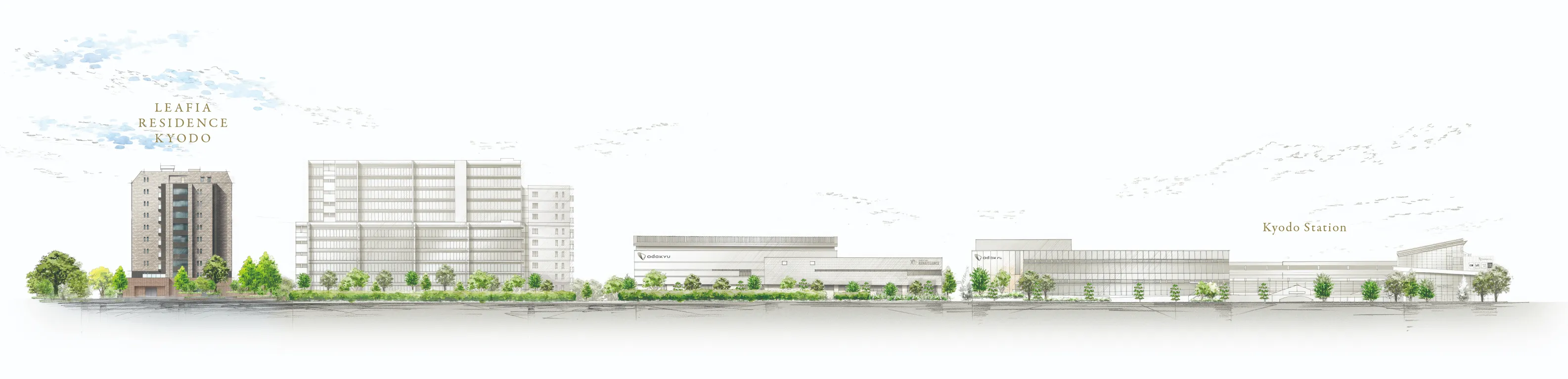 物件は「経堂テラスガーデン」内に位置しています。2011年に整備されたこの再開発エリアは、グリーンプロムナードや芝生広場、飲食・商業施設が一体となって整備されており、駅前の整然とした街並みが形成されています。マンションが街並みの一部として計画されているのは、ランドスケープの観点でも大きなプラスです。