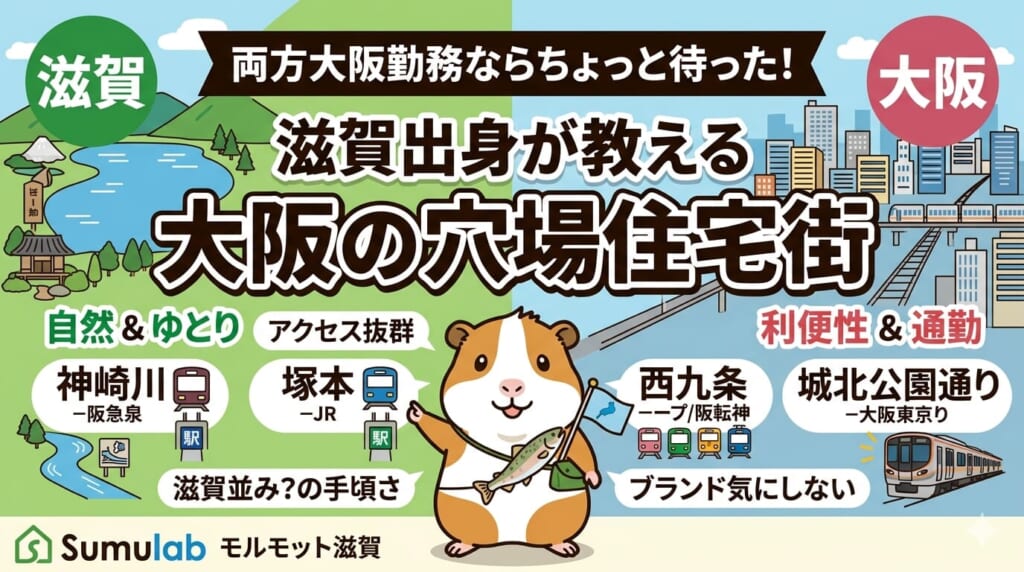 大阪で、かつ中心地である梅田エリアにも近く、滋賀並みとまではいかなくても手が届く範囲のエリアはあります! もちろん琵琶湖など滋賀ならではの魅力を感じて滋賀に来るならいいのですが、「安いから」だけで買うというても通勤1時間コースなのでちょっとしんどいかもしれません。