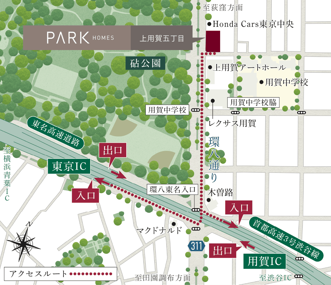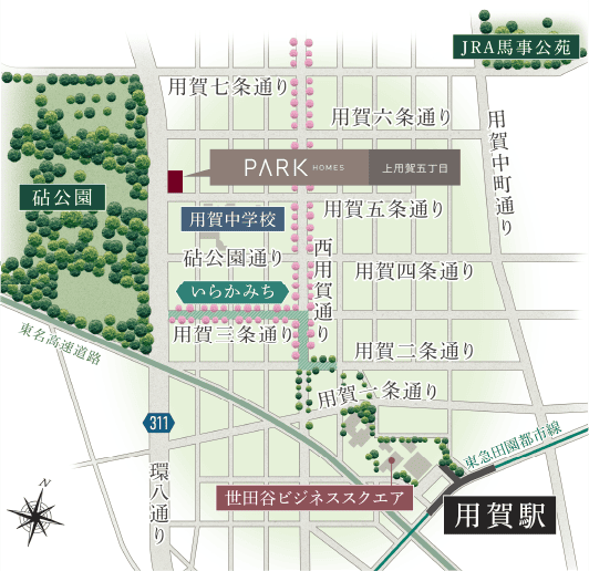 ザ・パークハウス 用賀プレイスは、パークホームズ上用賀五丁目より南側のエリアになります。
