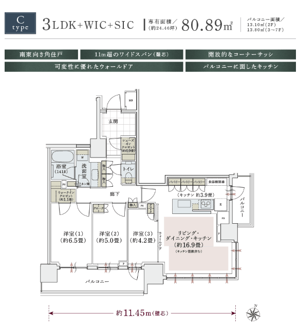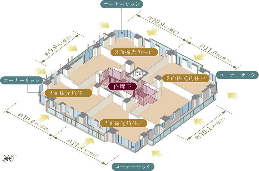 内廊下設計、ワイドスパン×全居室直接採光のプラン設計。実物が体感できる竣工販売。