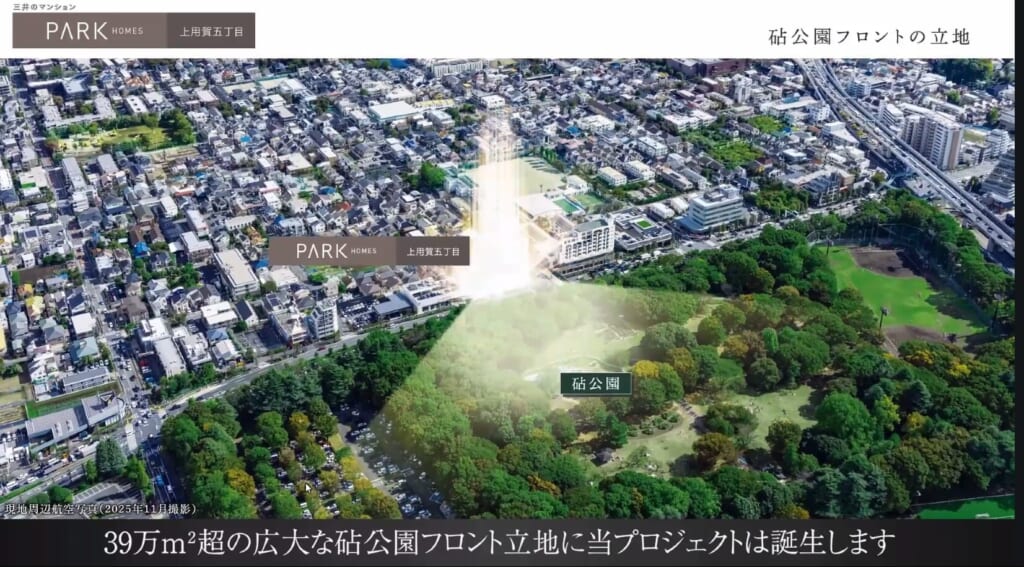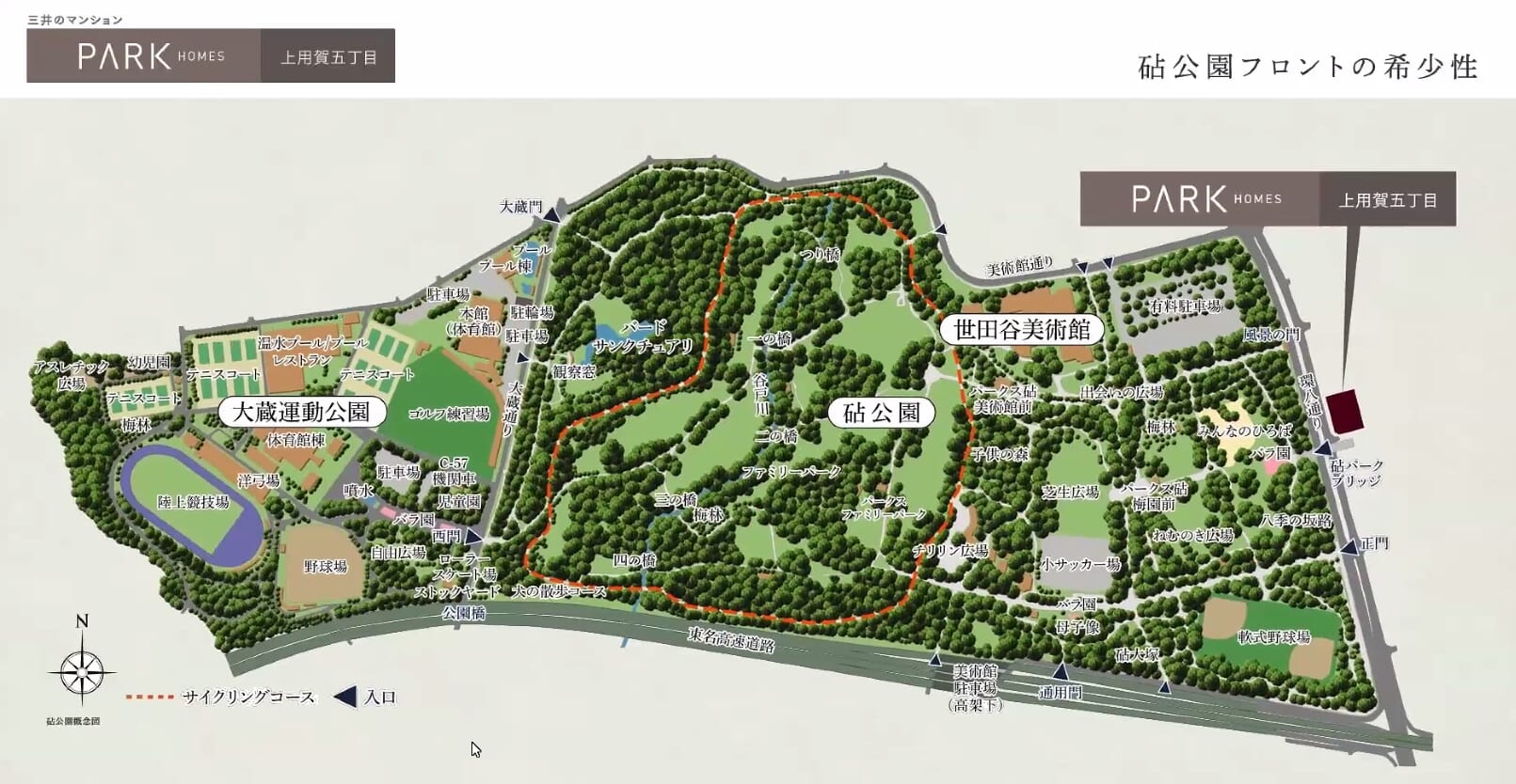 39万平米超の砧公園フロント立地、東急田園都市線「用賀」駅から「渋谷」駅へ直通14分。