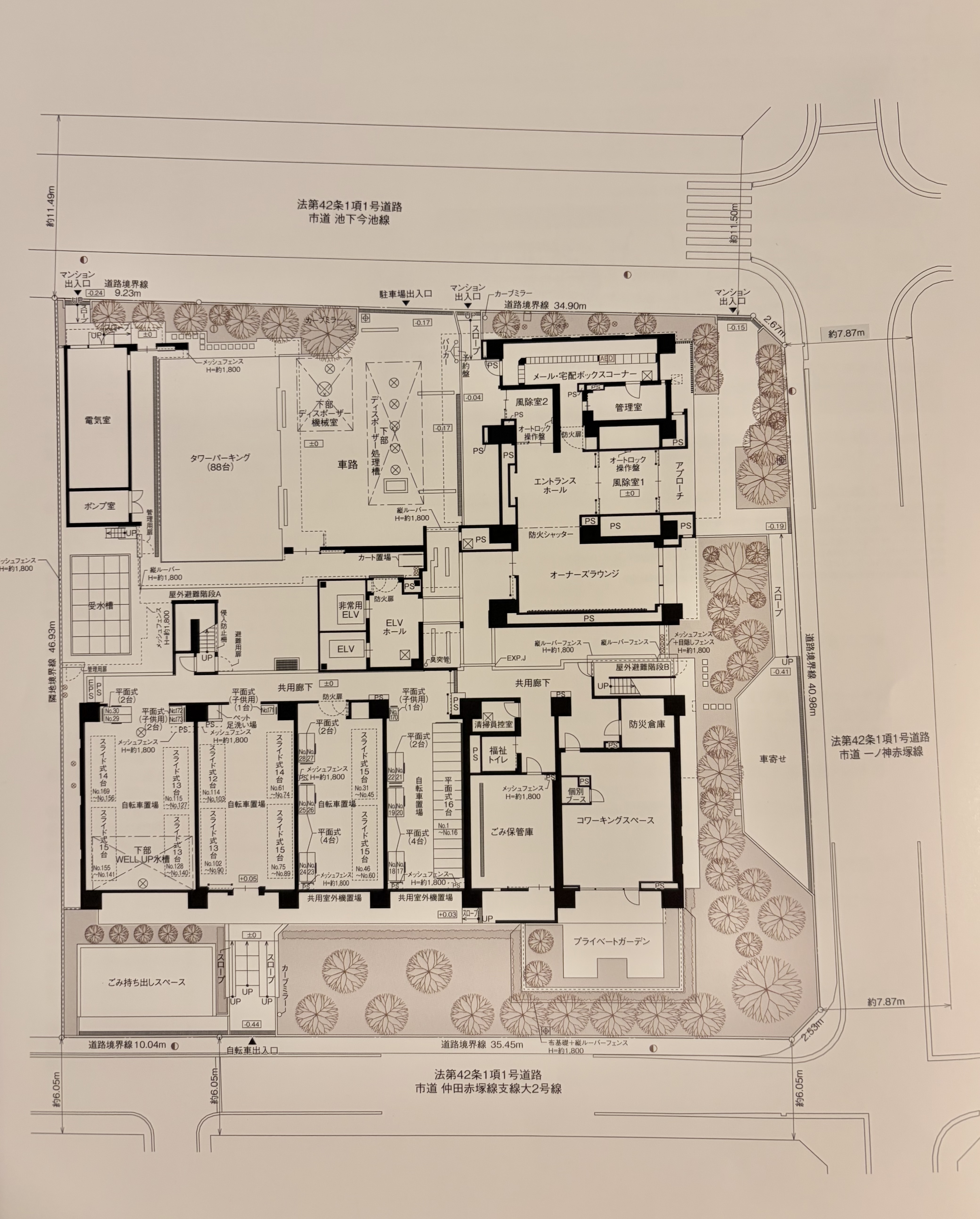 南棟が20階建、東棟は12階建となっておりこの2つをエクスパンションでつないでいるような建物構造となっています。そのため棟は異なりますがエレベーターやエントランスなどの共用施設については一体で使用したりと実質1棟のように使用する形となります。そして敷地北西側についてはタワーパーキングとなっており、真ん中らへんには先ほど述べたカート置き場が!まだイオンリテールより発表がないので公式サイトでも前面に出していないのでしょうが、内部的には何かしらの形でスーパーが戻ってくるということが決まっているようにも感じます。(敷地西側の土地をピンクにしているあたりが思わせぶりですね)