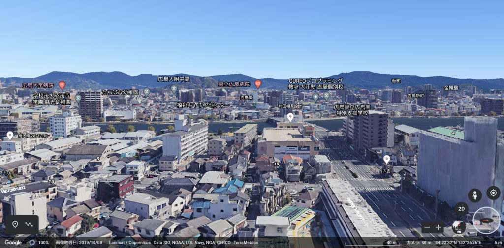 GoogleEarthを使用した、現地高層階からの眺望イメージです。東側は戸建てが中心のため、視界を遮るものがなく、本川を超えた向こう岸が見渡せます。