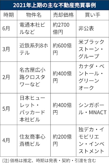 ファンドの活発な投資姿勢は、コロナ禍に苦しむ企業による不動産売却の受け皿になっている。みずほ信託銀行のシンクタンク、都市未来総合研究所が集計した21年1~6月の国内不動産の売却額(公表ベース)を見ると、事業法人(不動産や建設除く)と金融法人が6583億円と、半期ベースでリーマン危機前の08年1~6月以来の高水準となった。平山重雄常務研究理事は「業績悪化の穴埋めなどで企業の資産売却が増え、外資系ファンドがその受け皿となっている」と指摘する。