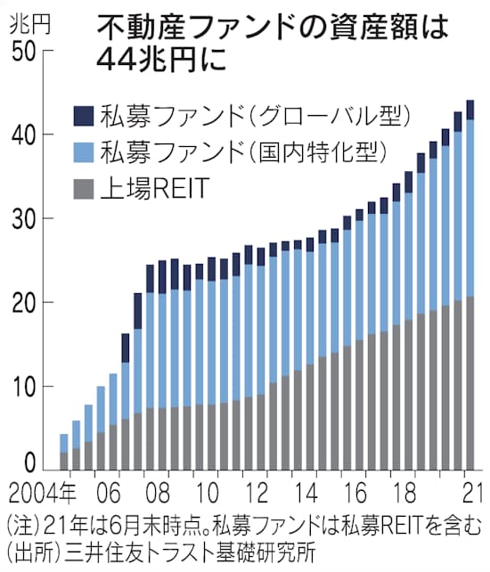 企業売却物件の受け皿投資信託日経新聞より不動産に国内外の投資マネーが流入している。上場不動産投資信託(REIT)や私募ファンドを含めた資産額は2021年6月末で44兆円を超え、過去最高を更新した。低金利で運用難に悩む地方銀行や海外投資家が、安定した利回りを期待できる日本の不動産に着目する。新型コロナウイルス禍で企業が自社物件を手放す動きが広がるなか、ファンドが受け皿となっている。