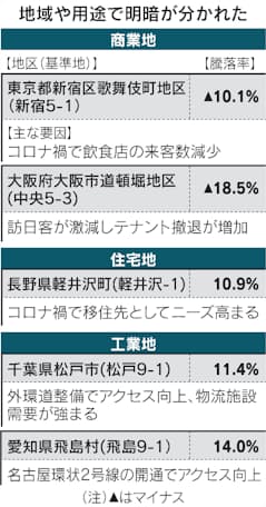 国土交通省が21日発表した2021年の基準地価は住宅地や商業地など全用途の全国平均が前年比0.4%下がり、2年連続の下落となった。際立ったのが2年目の新型コロナウイルス禍の下で進む地価の「地殻変動」だ。全国的に下落する中で上昇した地点に目を向けると、海外の緩和マネー流入や在宅勤務による住環境の再評価というけん引力が浮かび上がる。