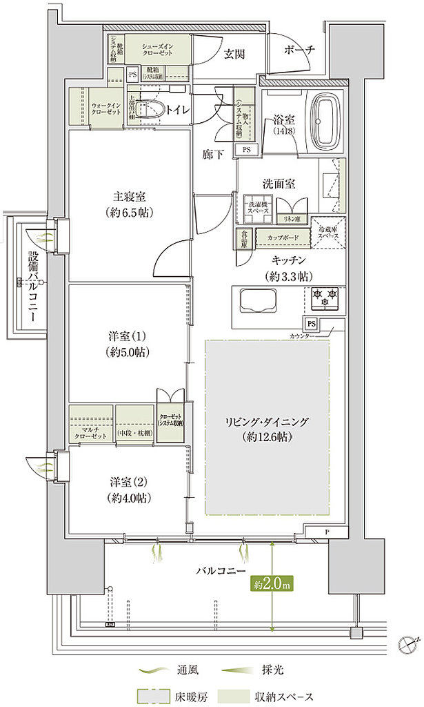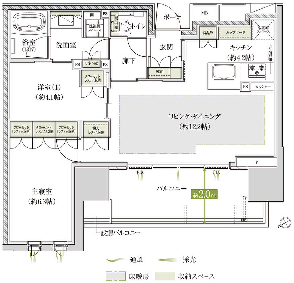 - T2サッシ(南東住戸のみ)、Low-Eガラス