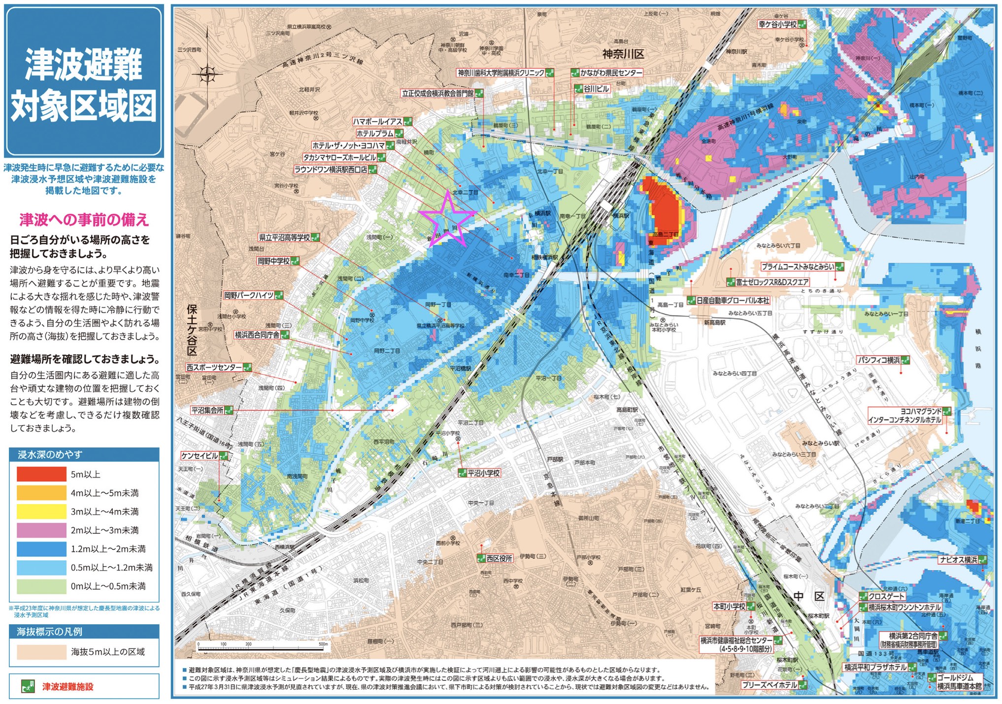 横浜市は、東京湾内への大きな津波の影響をもたらす想定地震として、「慶長型地震」を想定しています。この地震による津波発生により、0.5m以上1.2m未満の浸水が予測されている場所です。