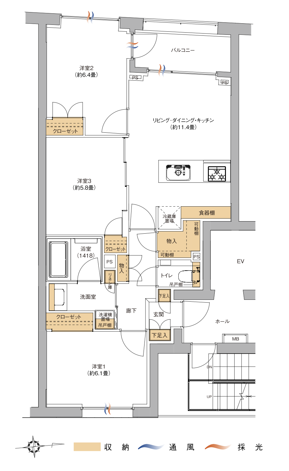 さらにこのエレベータ配置によって、内廊下の面積を抑えることができているため、全戸で東西に窓を設けることができており、居住性の面でもメリットがあります。