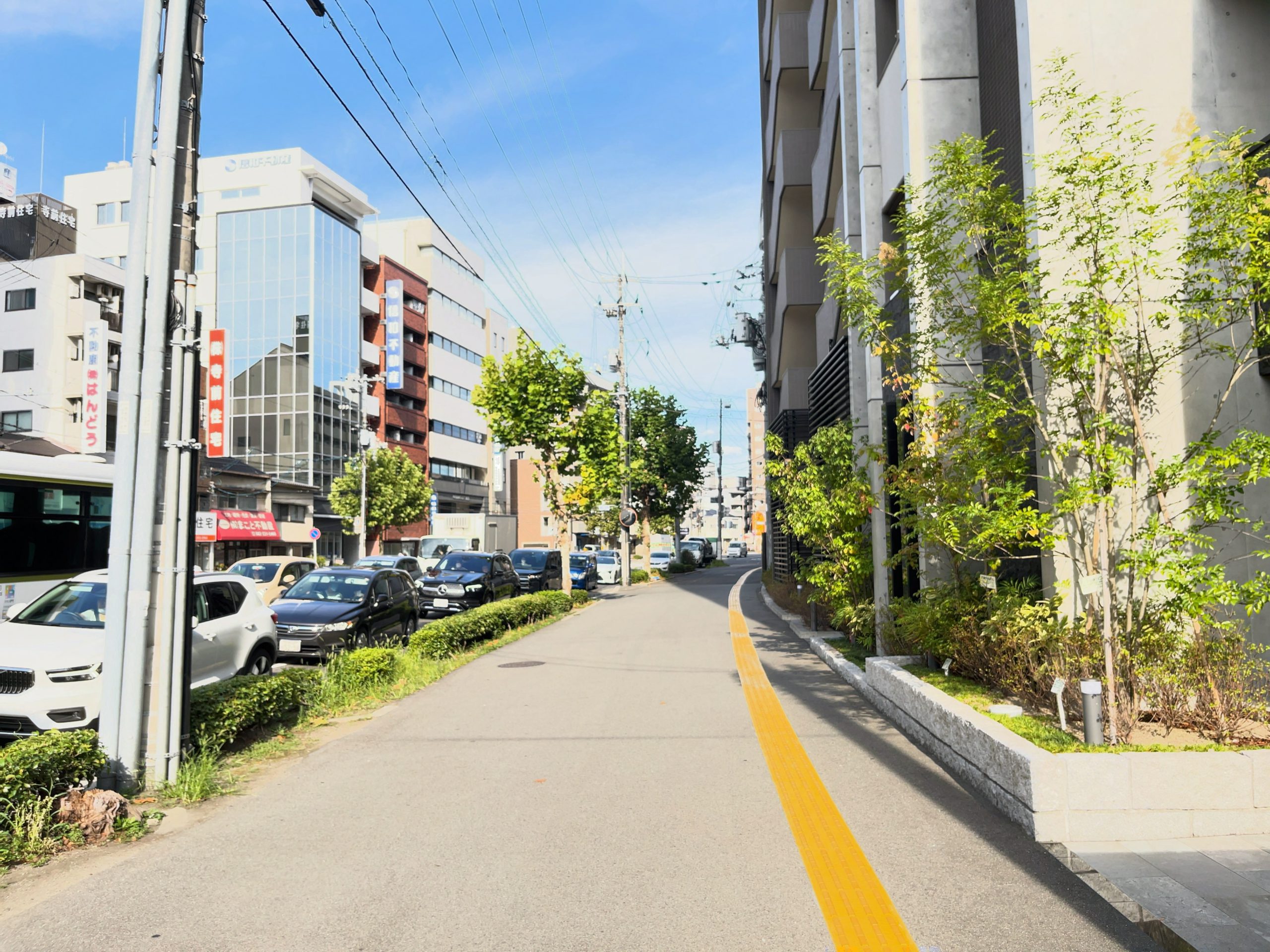 南側の大通りに出ての東側の様子です。マンションやオフィスビルが多く、お店などは見あたりませんでした。