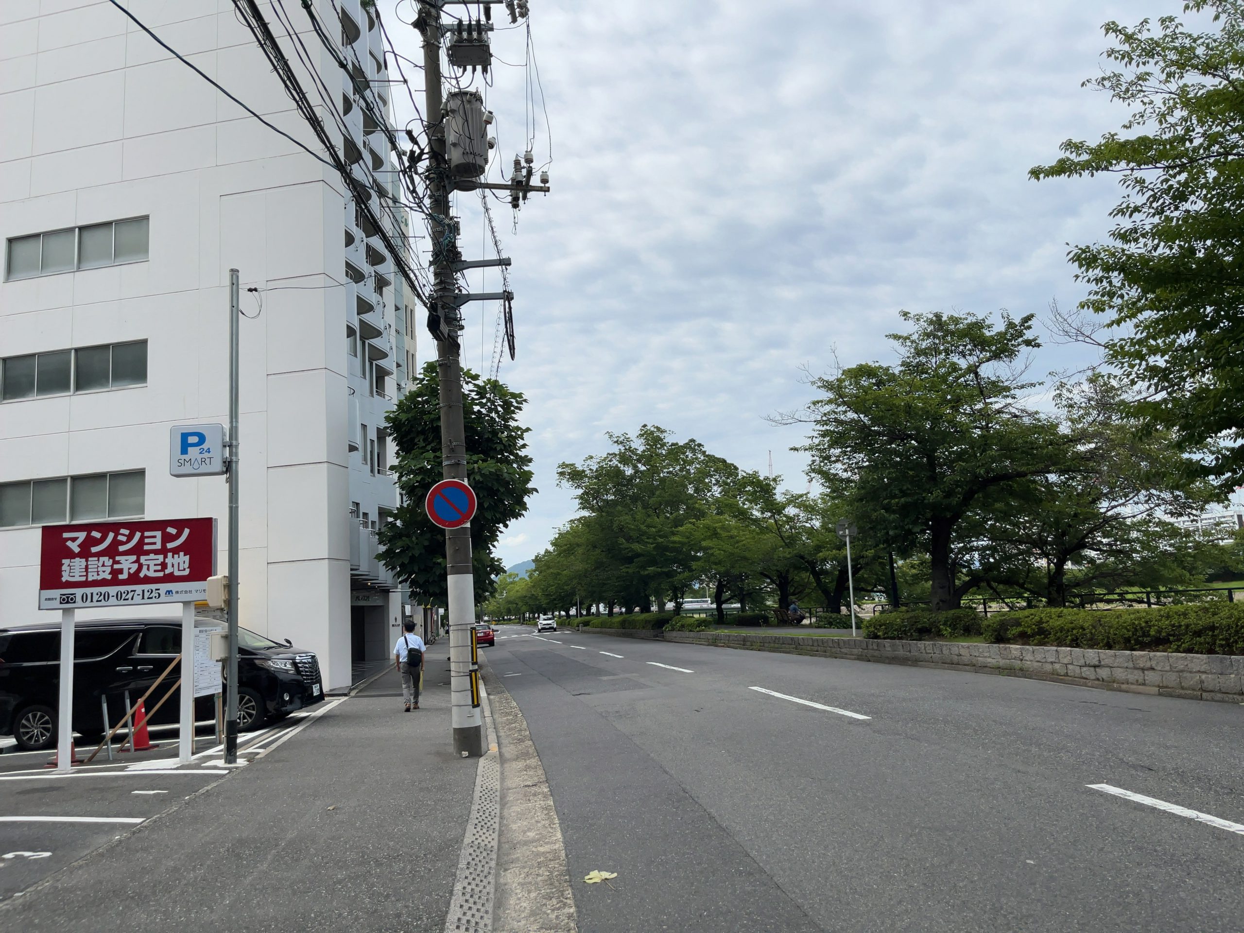 予定地東側の様子です。写真左側は竣工直後の「フローレンス庚午中ブライトライツ」です。このまま進むと庚午橋があります。
