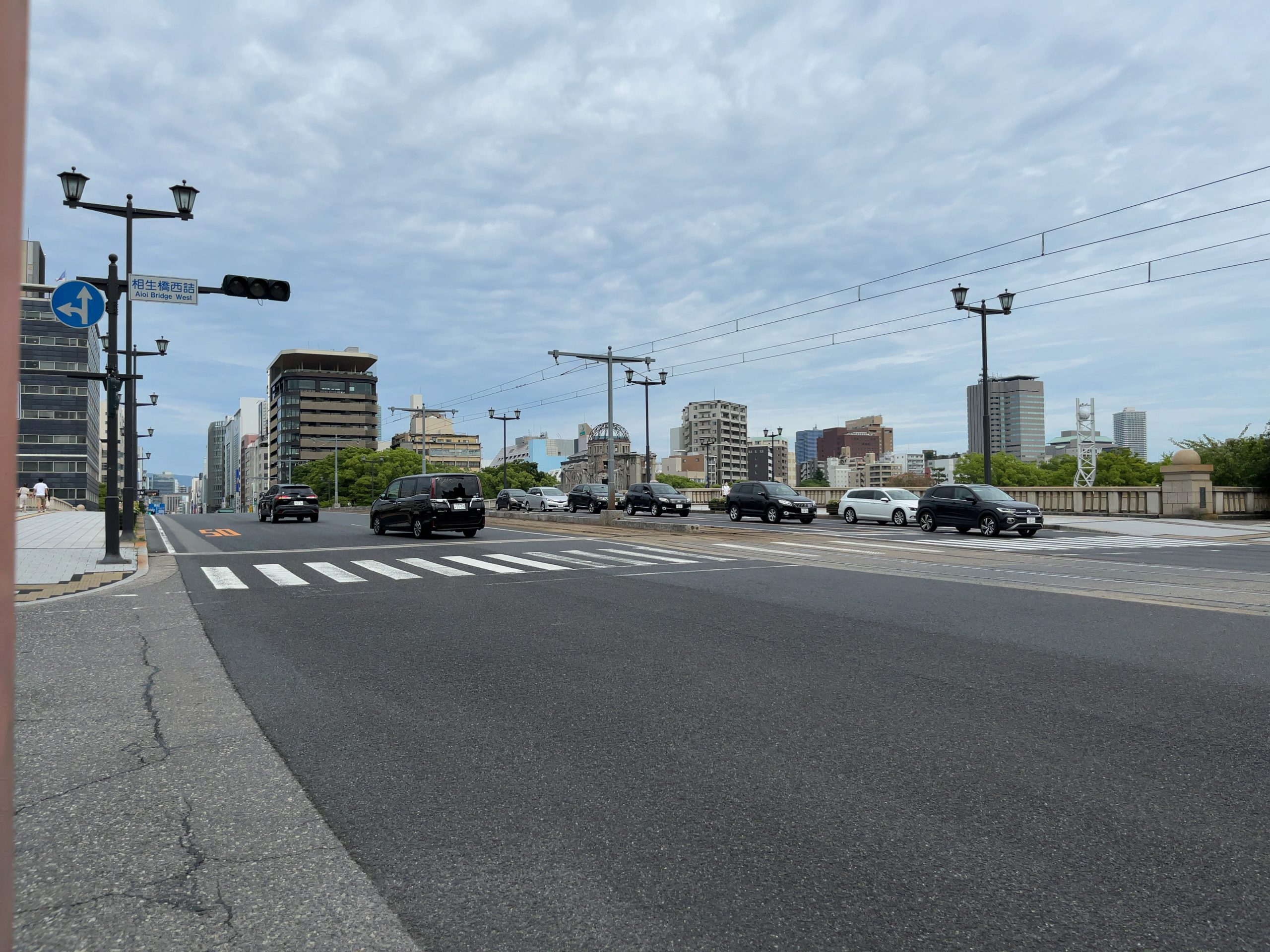 南側の大通りに出ての西側の様子です。原爆ドームとおりづるタワーが見えますね、相生橋を渡ると紙屋町エリアになるので、都心部にすぐにアクセスできます。