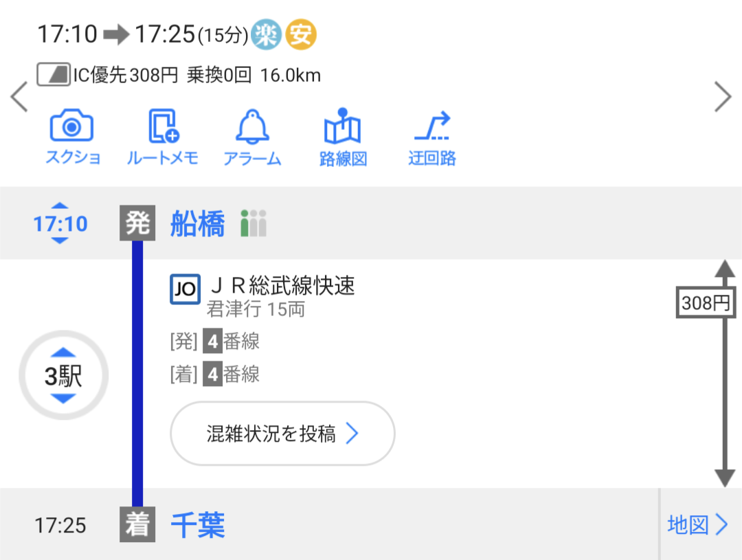 8:15 玄関ドア(徒歩)8:22 船橋駅着
