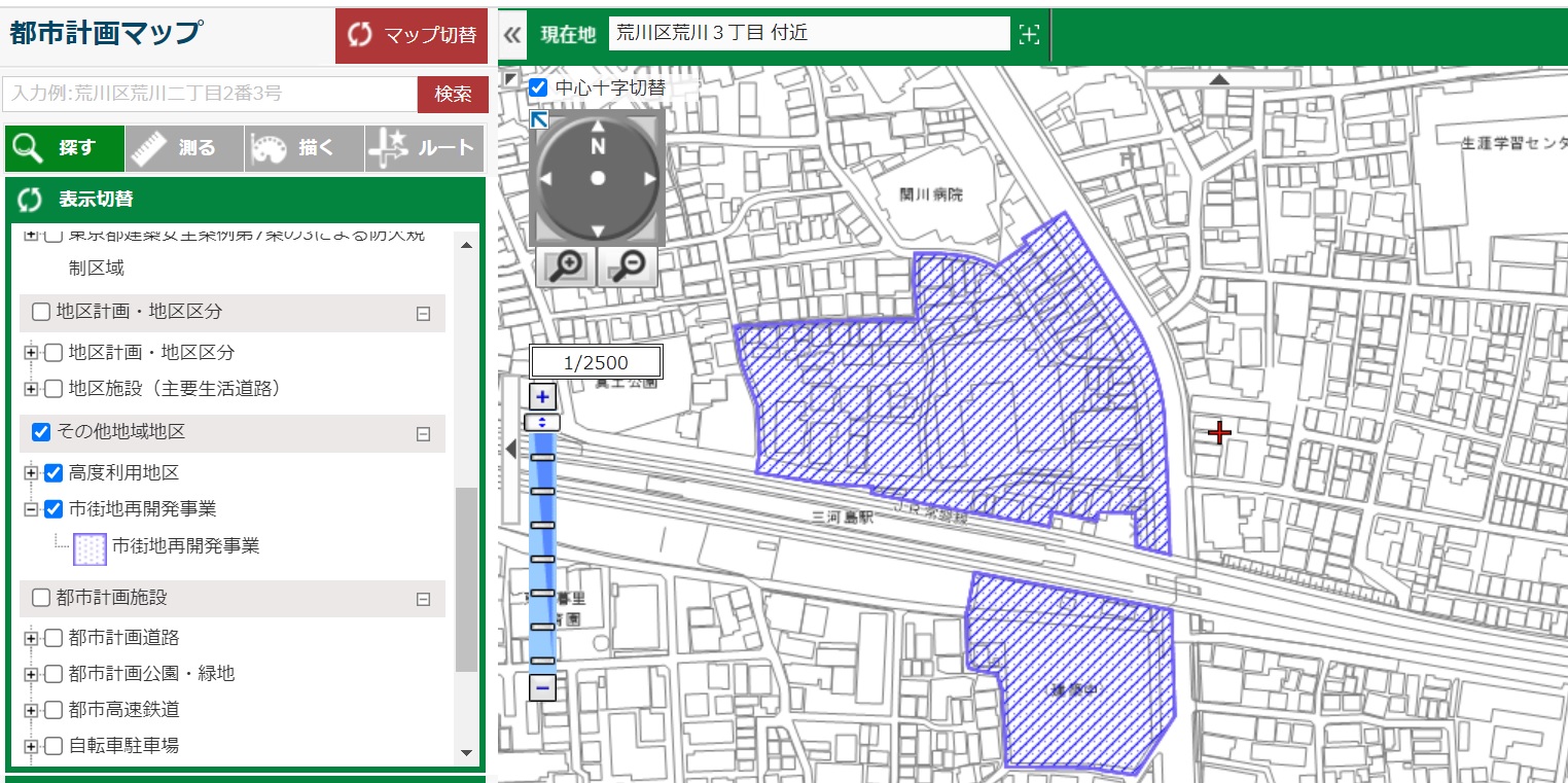 そんなエリアではありますが、再開発エリアの指定がされているのが本物件の目の前の地になります。(赤い十字の箇所が本物件)