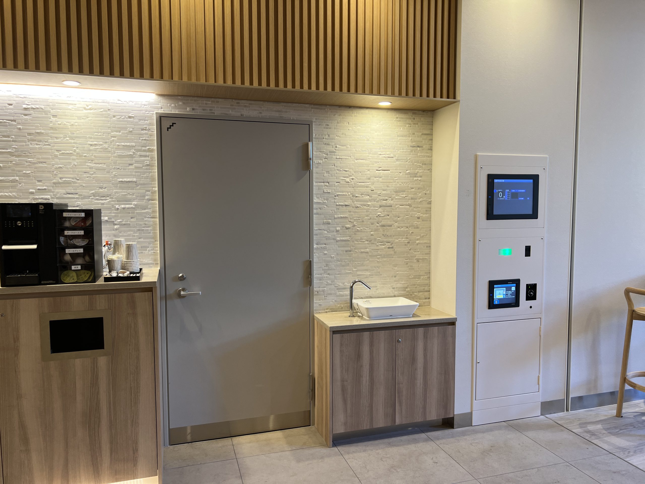 ラウンジに駐車場の操作板、手洗いカウンター、コーヒーマシンがあります。
