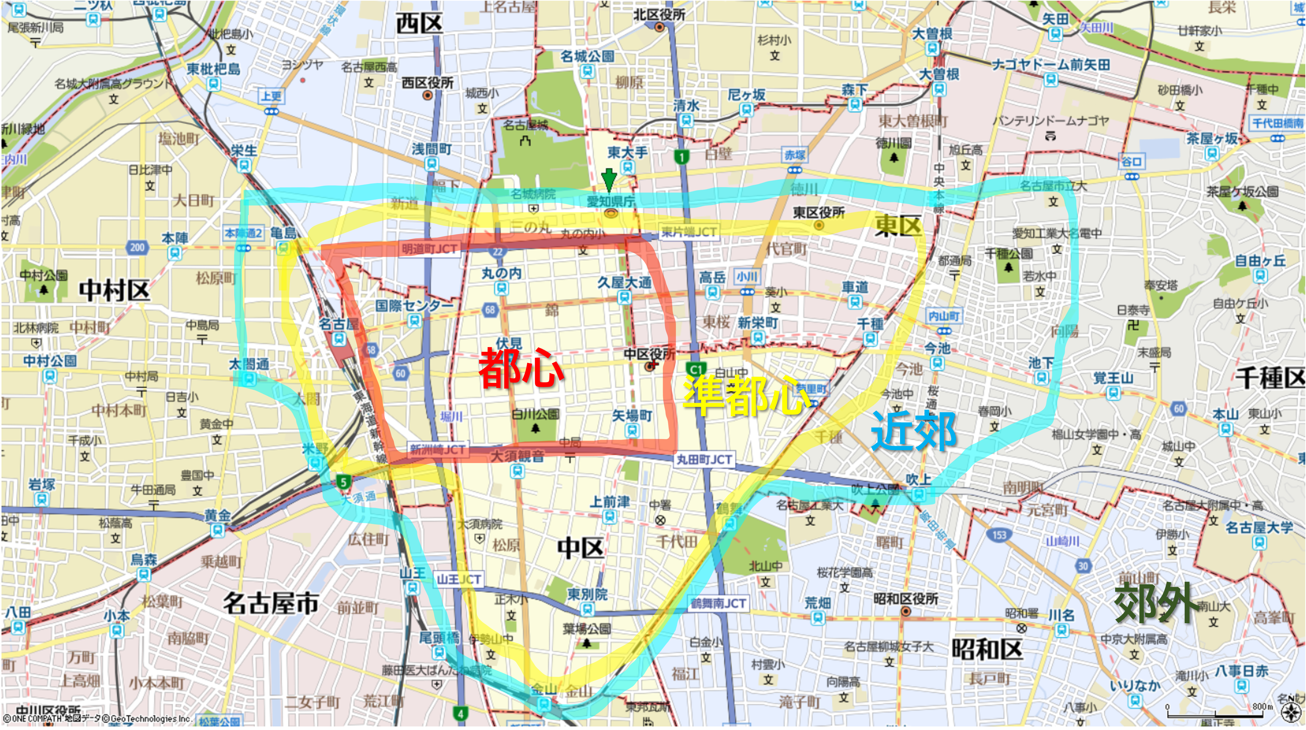さて、みなさまに質問です。名古屋の都心・準都心・郊外をこのマップ内で囲って頂けますでしょうか。都心・都心と仰いますが、そもそも都心をどこと仮定しておりましたでしょうか。